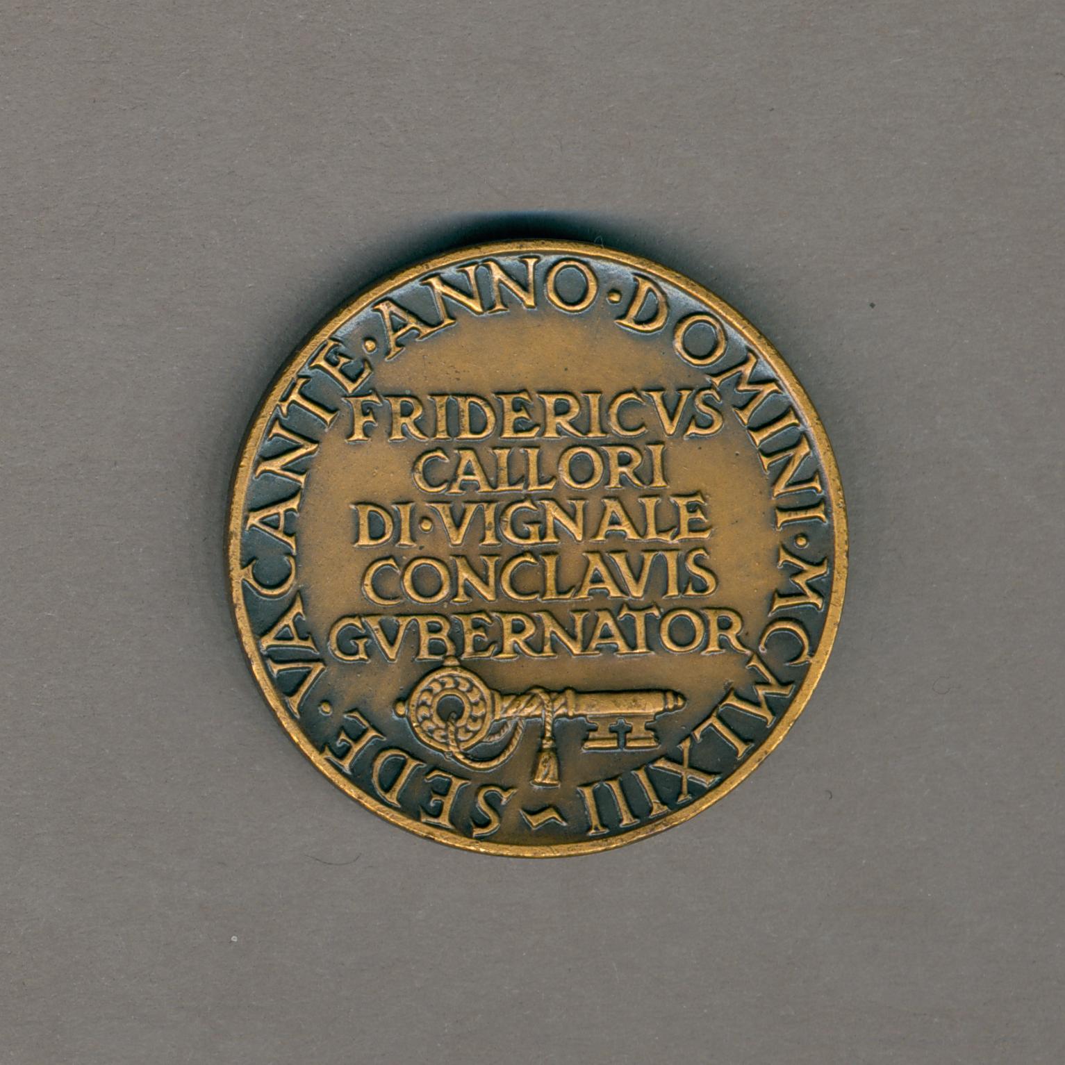 Sede-vacante-penning met wapenschild, met ", kz. met "... Fridericus Callori di vignale conclavis gubernator", sleutel