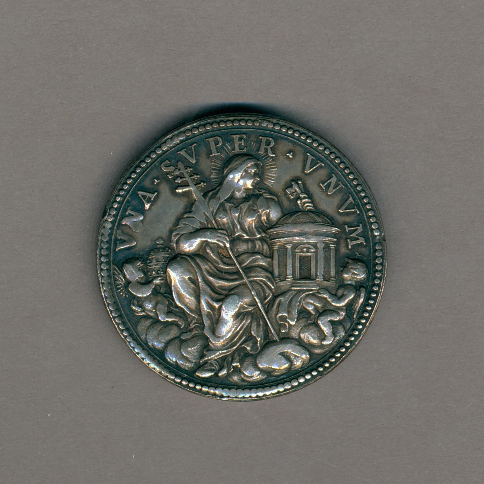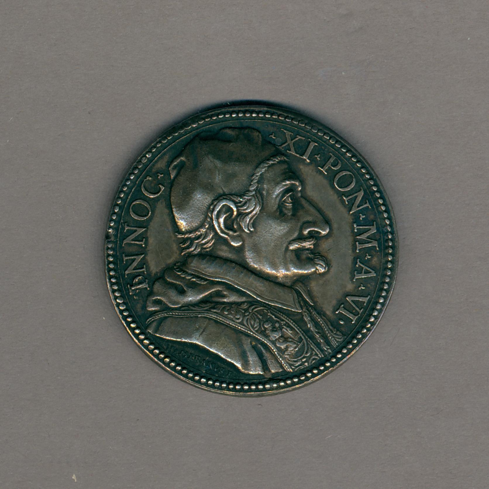 Pauspenning met portret paus Innocentius XI (1676-1689), met "... A VI", kz. allegorie op de kerk, met "Una super unum"