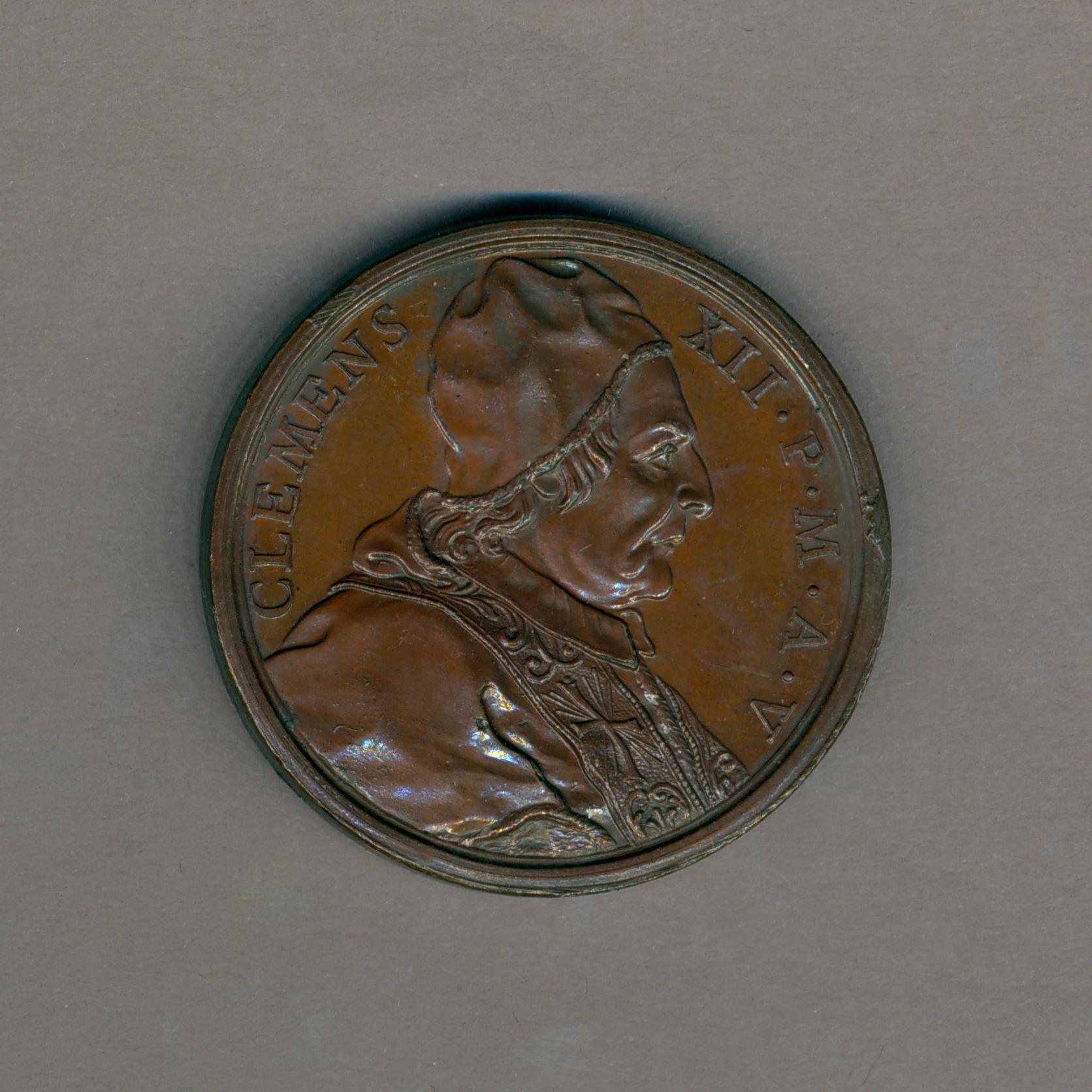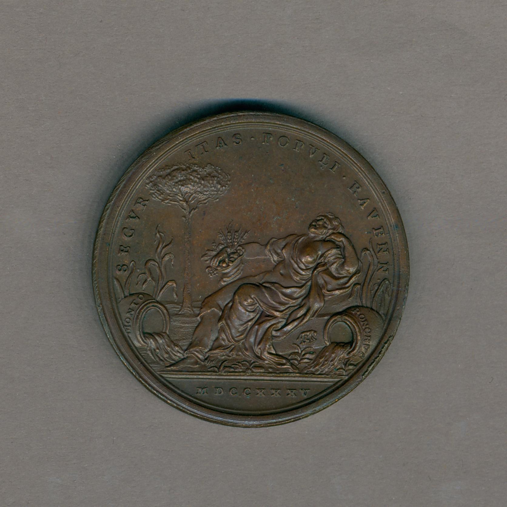 Pauspenning met portret paus Clemens XII (1730-1740), met "... A V", kz. allegorie op Ravenna