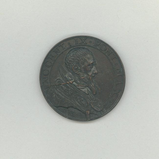 Pauspenning met portret paus Innocentius IX (1591), met "... AN I", kz. twee gekruiste sleutels