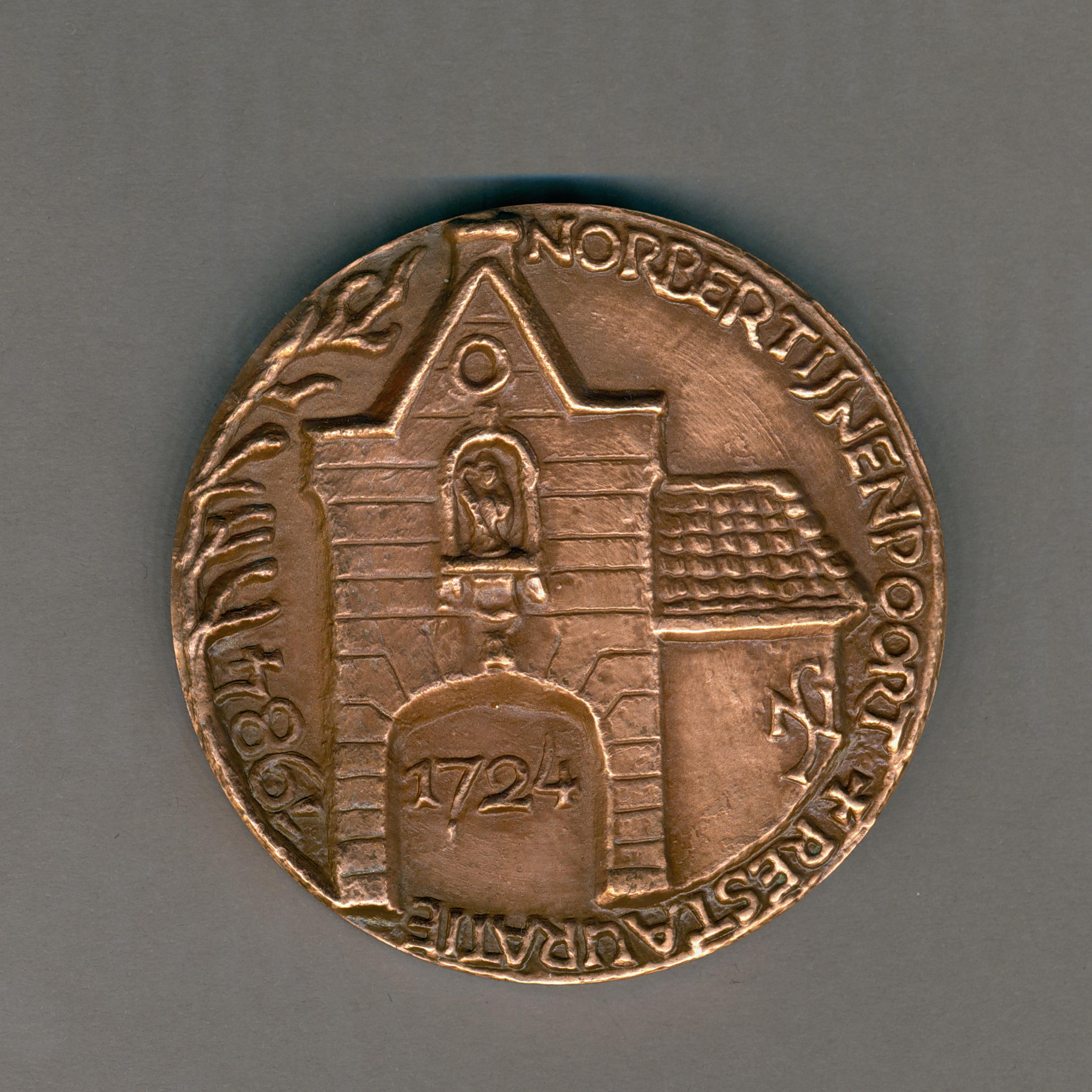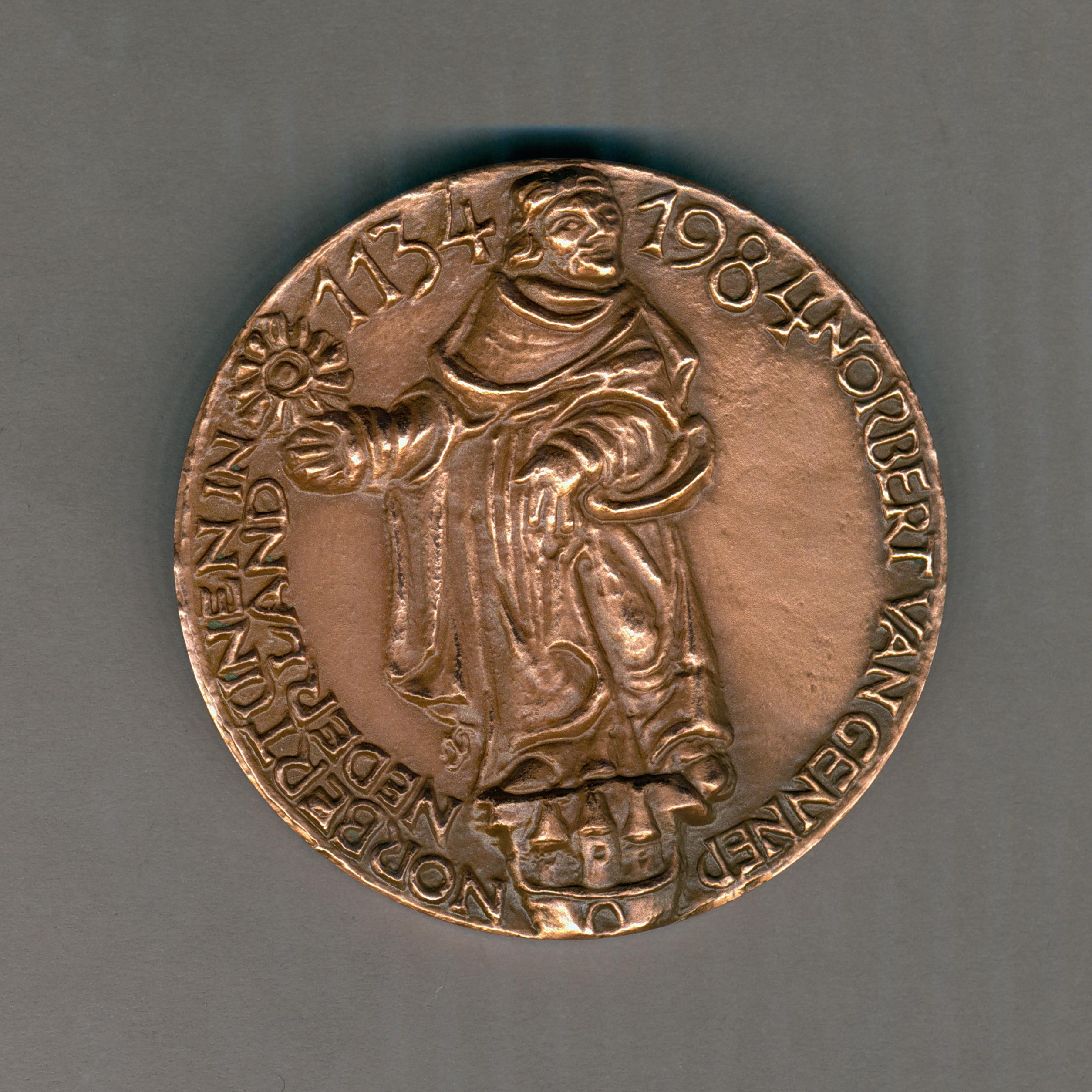Gedenkpenning met Norbert van Gennep op sokkel met het wapen van Tilburg, in zijn rechterhand een monstrans, kz. Norbertijnenpoort te Tilburg