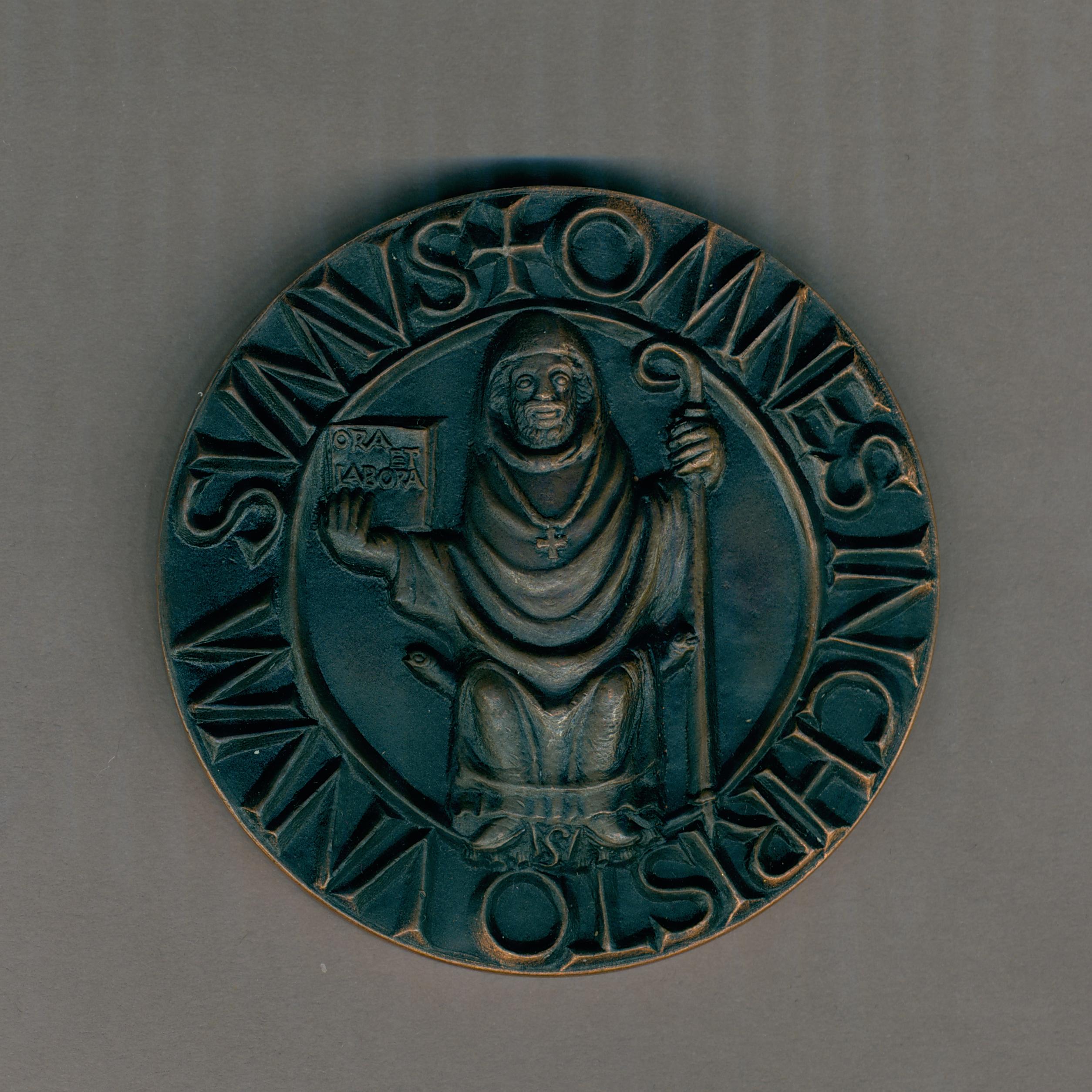 Gedenkpenning met tronende Benedictus met boek en abtsstaf, kz. over contouren van Europese kaart Benedictus in zes cirkels