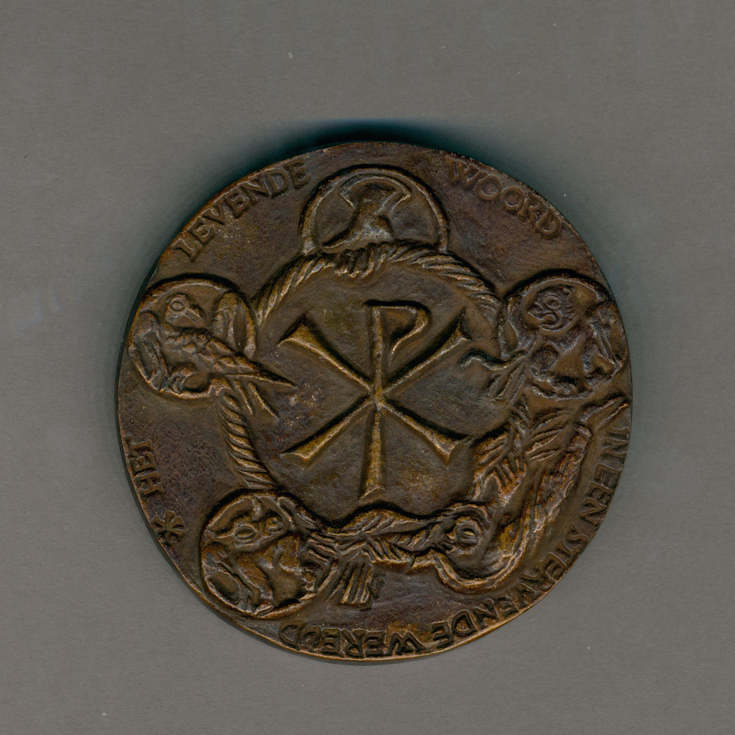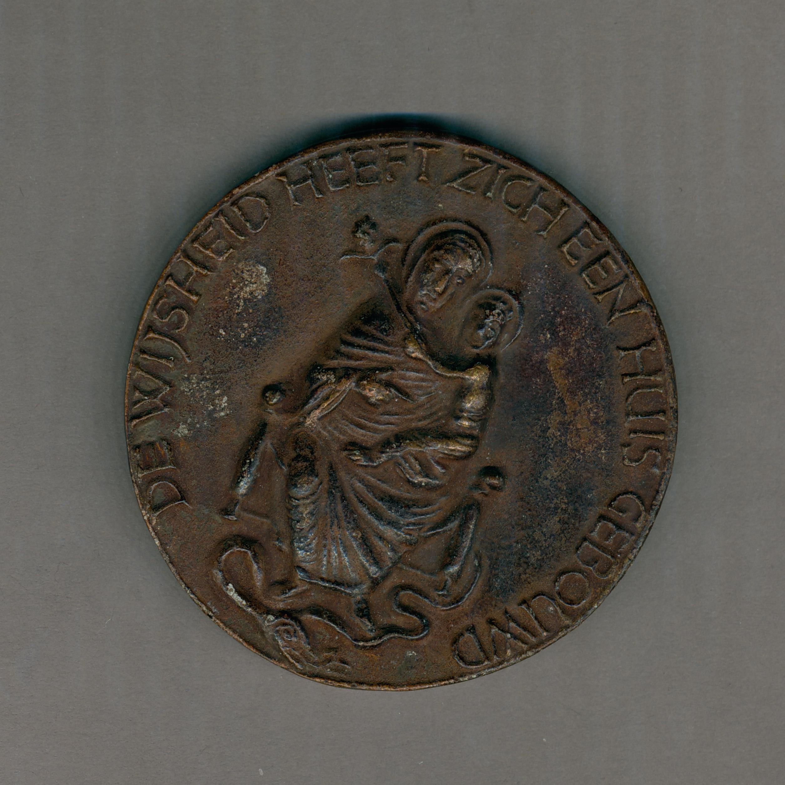 Gedenkpenning met Moeder Gods met kind, een slang vertrappend, kz. Christusmonogram binnen krans gedragen door Gods Hand en symbolen vier evangelisten