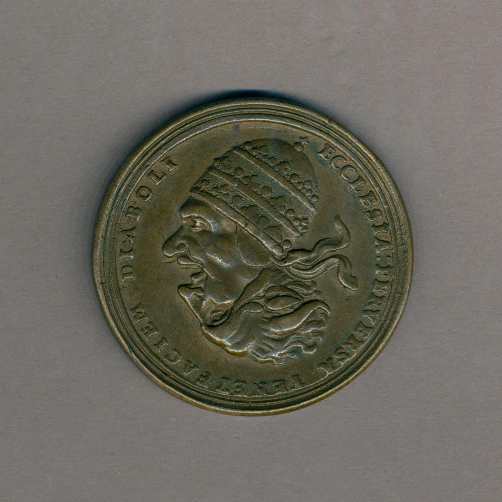 Spotpenning met dubbelkop paus-duivel, "Ecclesia perversa ...", kz. dubbelkop kardinaal-nar
