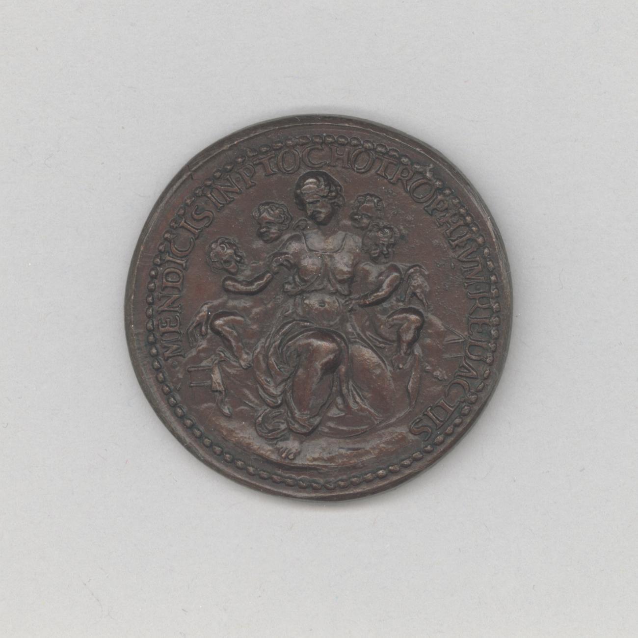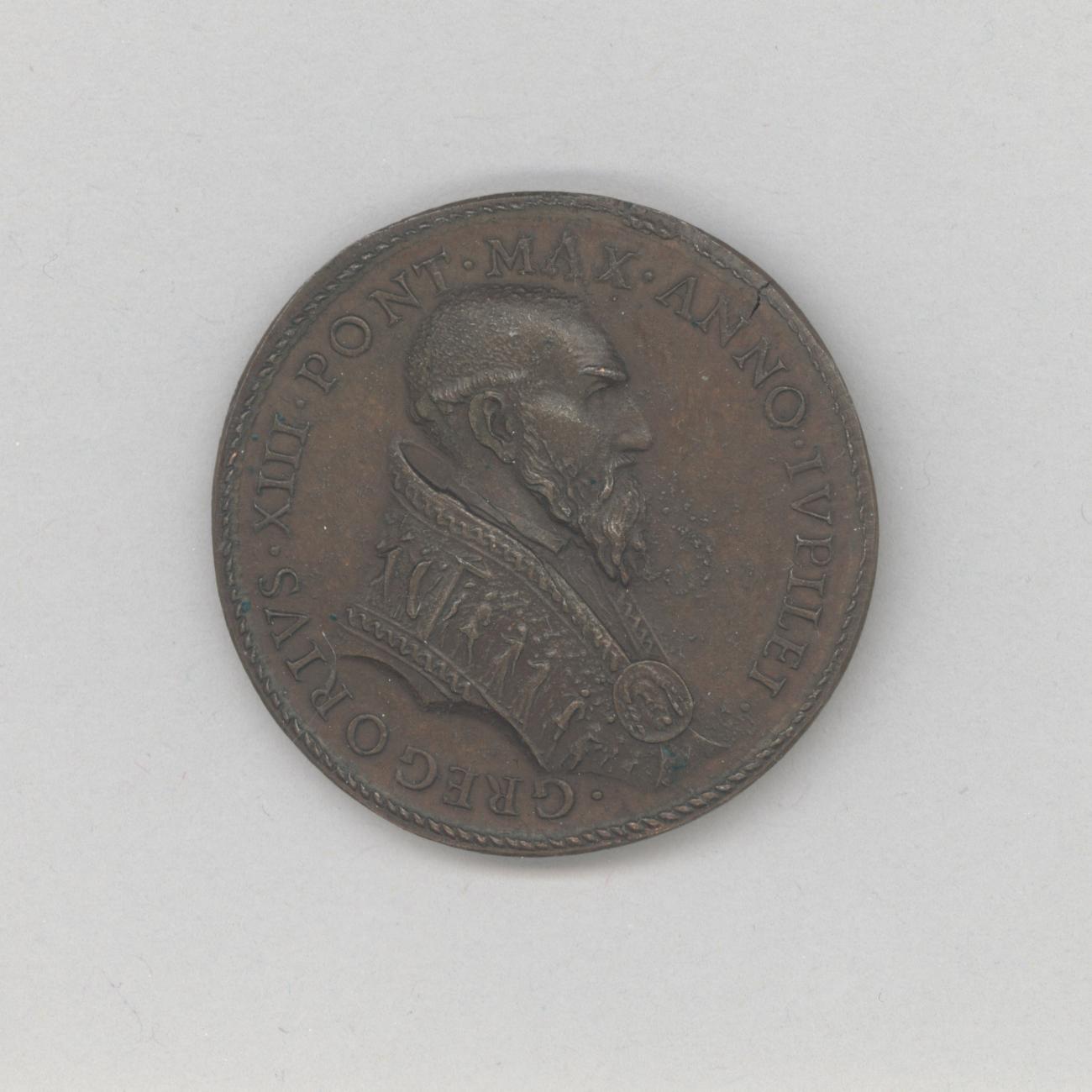 Pauspenning met portret paus Gregorius XIII (1572-1585), met "... ANNO IV", kz. vrouw, gezeten, met vier kinderen, Caritas(?)