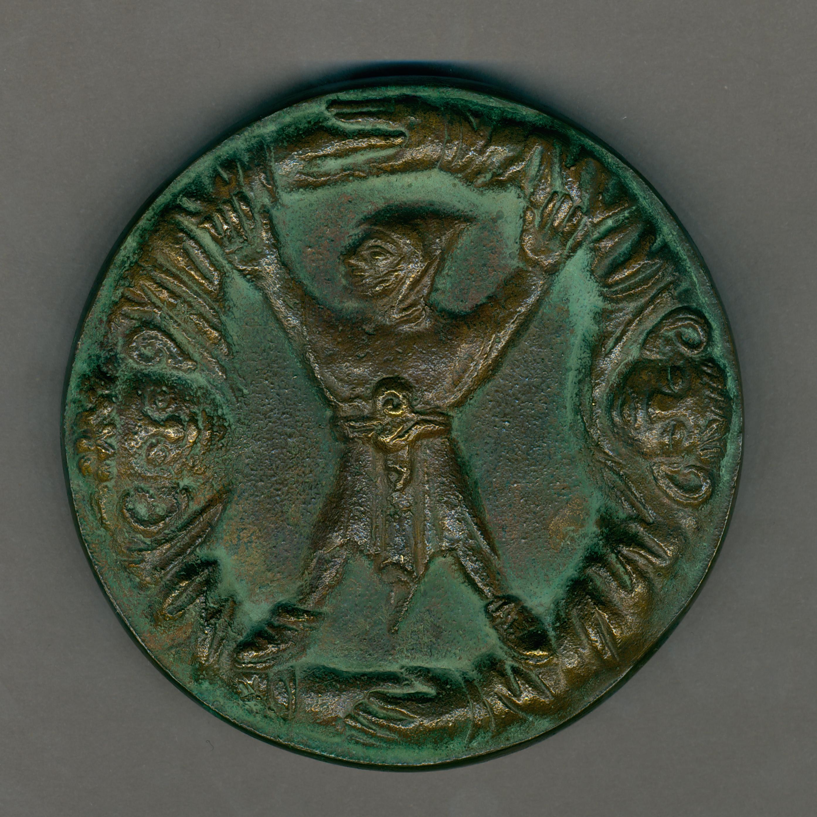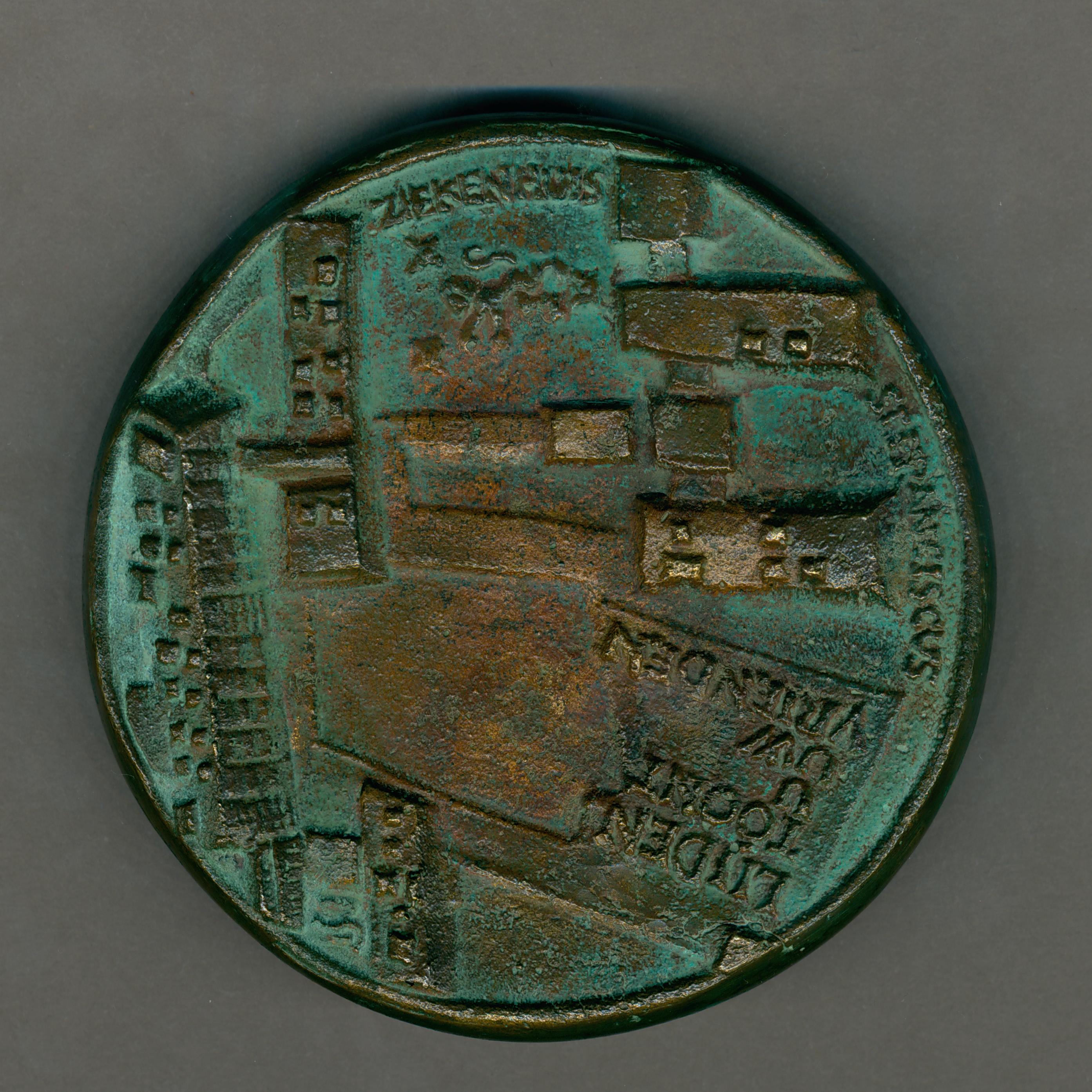 Gelegenheidspenning met St. Franciscus met gespreide armen en benen, omgeven door een symbolische weergave van de cyclus van het zonnelied, kz. St. Franciscus Ziekenhuis te Roosendaal met "Lijden toont u uw vrienden"