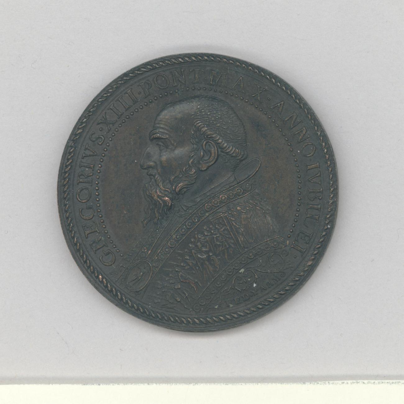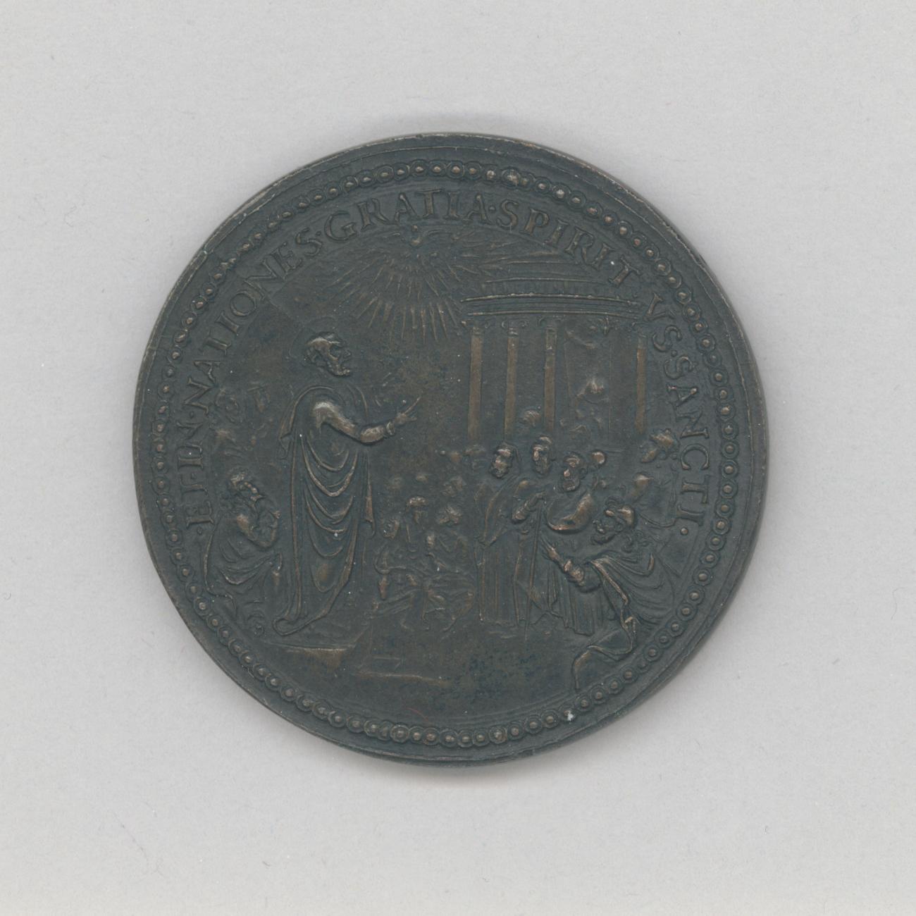 Pauspenning met portret paus Gregorius XIII (1572-1585), met "... ANNO IV", kz. St. Paulus spreekt op de areopaag Atheners toe