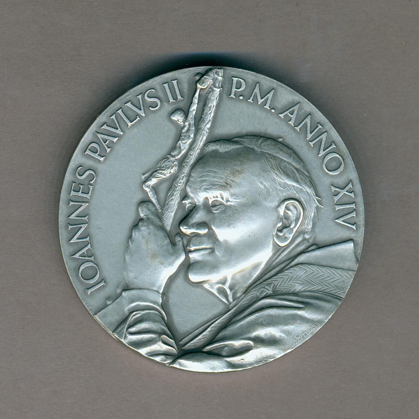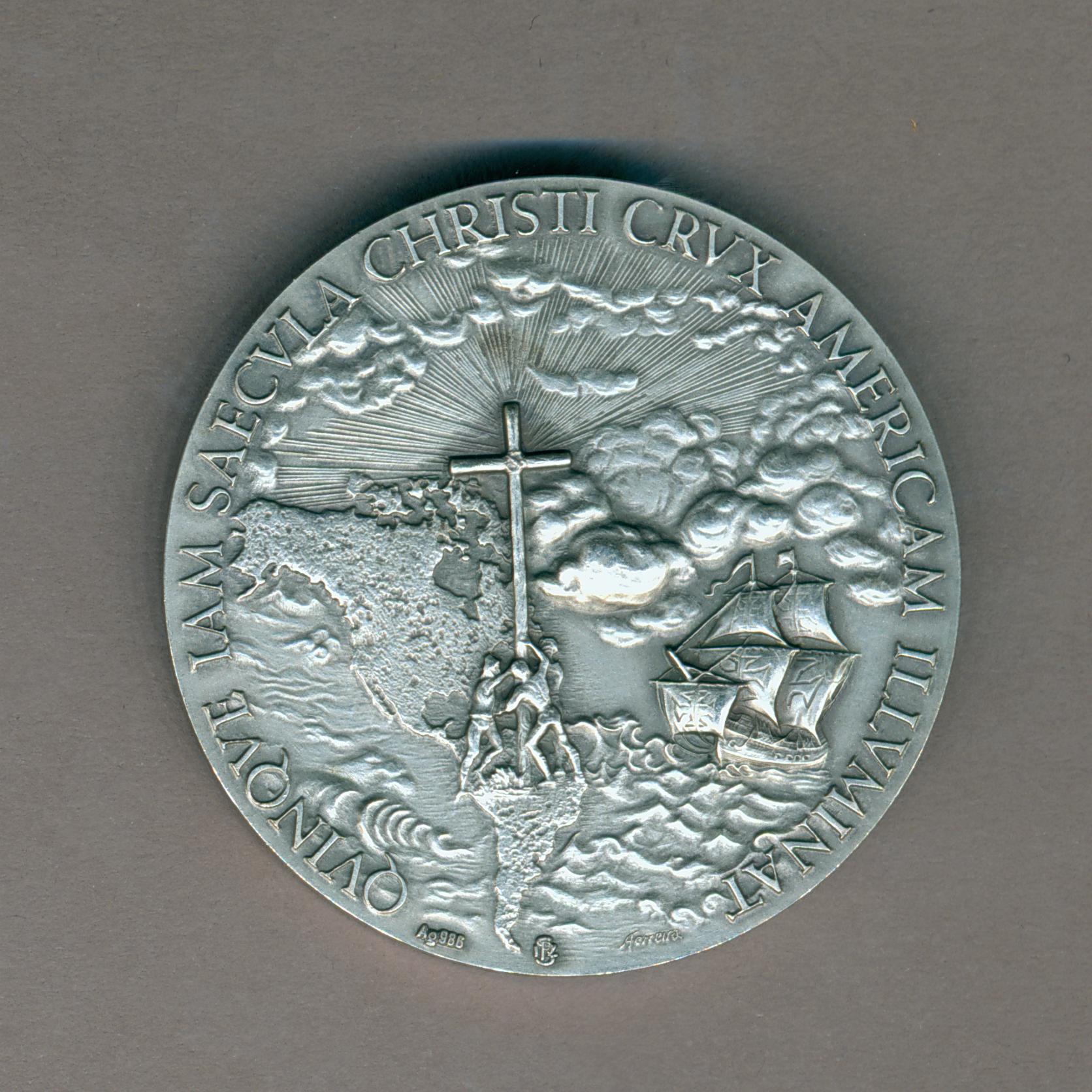 Pauspenning ter gelegenheid van 500 jaar evangelisatie Amerika met portret paus Johannes Paulus II (1978-2005), met "... ANNO XIV", kz. continent Amerika, kruis, schip