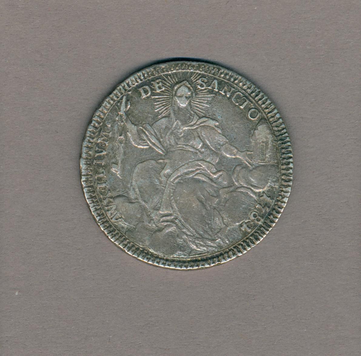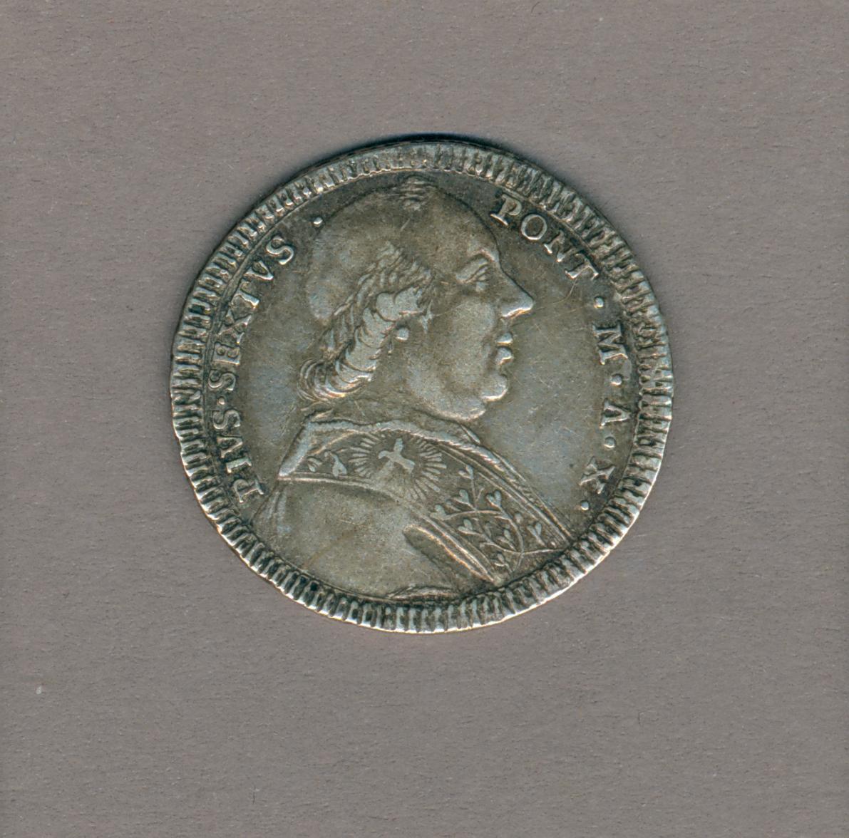 Pausmunt met portret paus Pius VI (1775-1799), kz. allegorische voorstelling van de kerk op de wolken