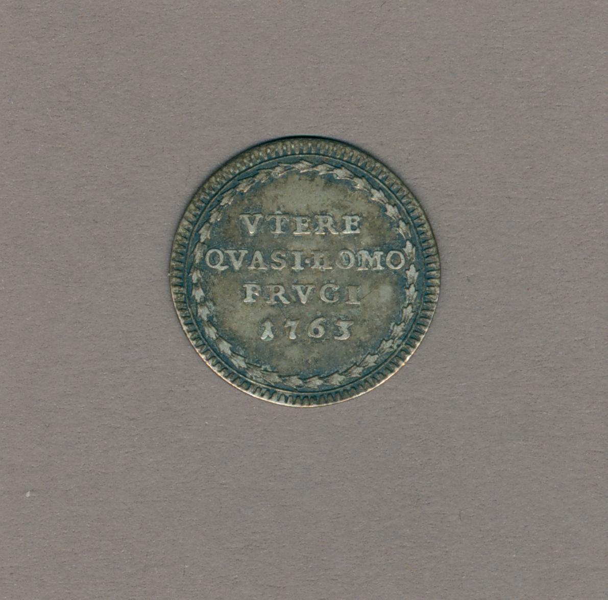 Pausmunt met pauselijk wapen paus Clemens XIII (1758-1769), kz. "VTERE QVASINOMO FRVGI"