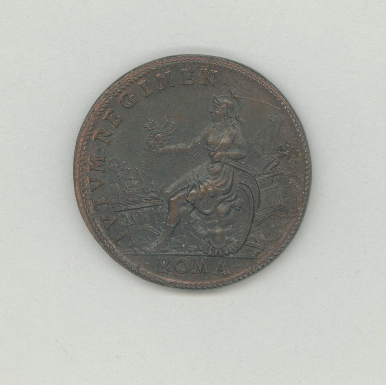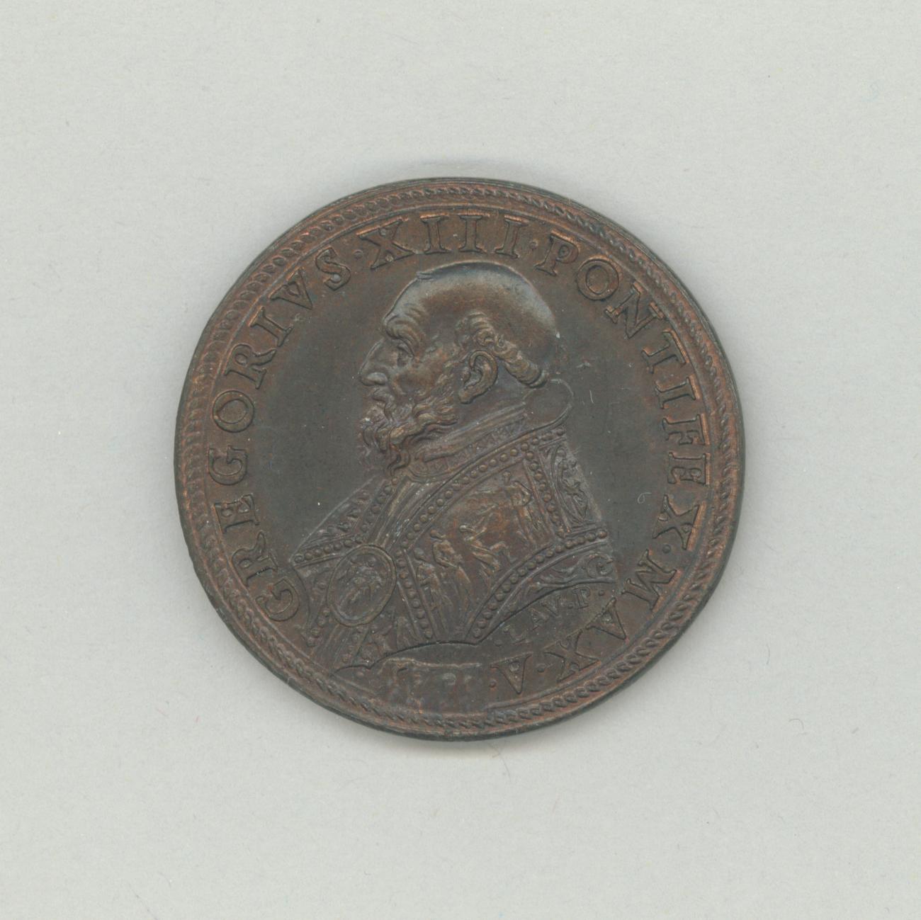 Pauspenning met portret paus Gregorius XIII (1572-1585), met "... A 1583", kz. zittende vrouw met op de rechterhand een draak, links een tafel met tiara, kromstaf en kruis, rondom wapentuig