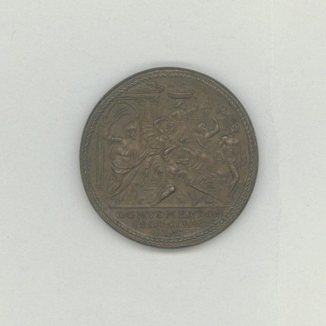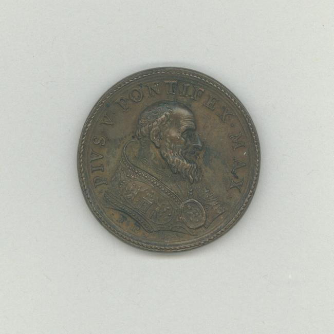 Pauspenning met portret paus Pius V (1566-1572), kz. Jezus verdrijft de kooplieden en geldwisselaars uit de tempel