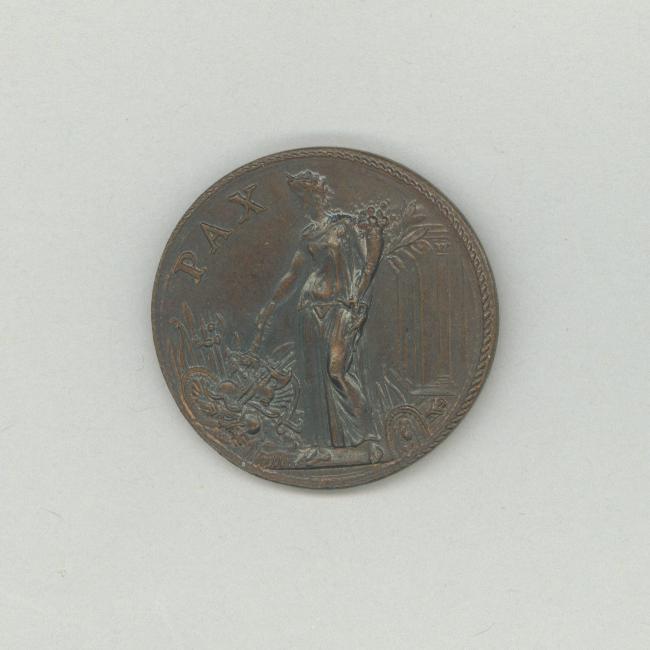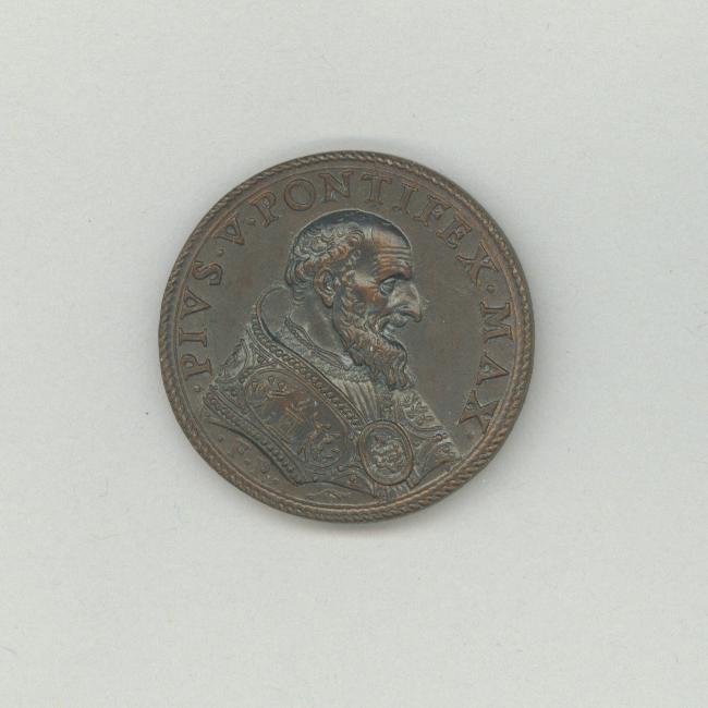Pauspenning met portret paus Pius V (1566-1572), kz. vrouw als personificatie van de vrede steekt met fakkel in rechterhand wapentuig in brand, in linkerhand hoorn des overvloeds