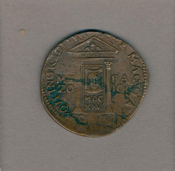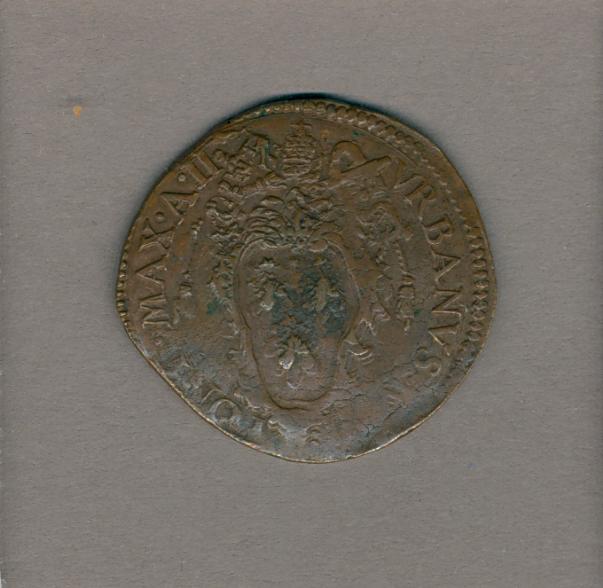Halve baiocco met pauselijk wapen paus Urbanus VIII (1623-1644), kz. Heilige deur met doek van Veronica