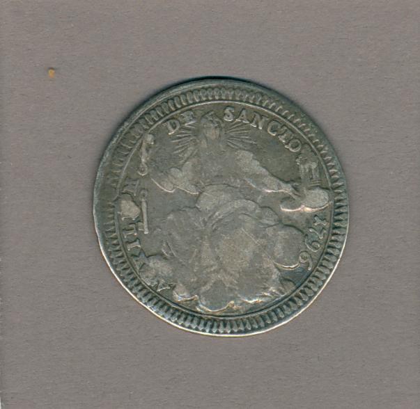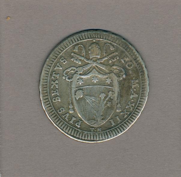 Pausmunt met pauselijk wapen Pius VI (1775-1799), kz. H. Maagd op wolken