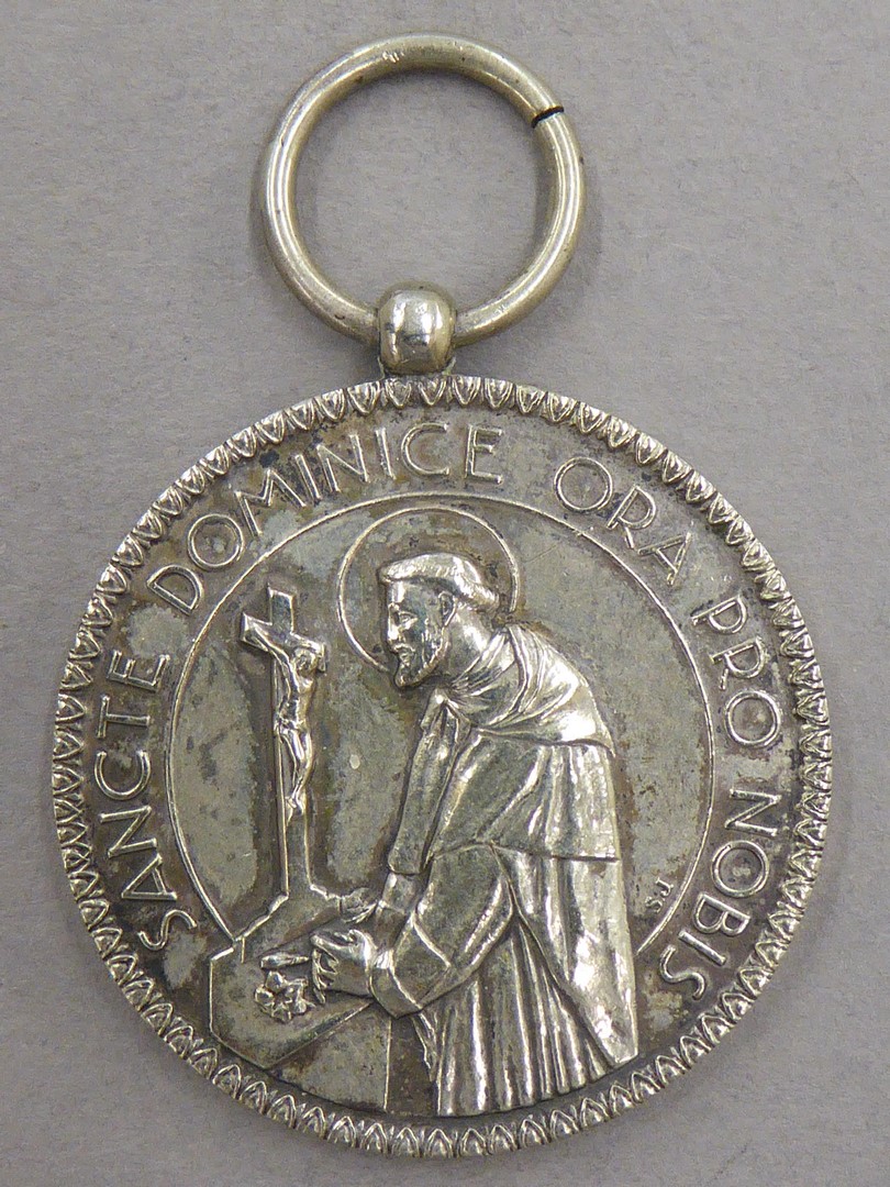 Draagpenning met H. Dominicus voor kruisbeeld met "Sancte Dominice ora pro nobis", kz. wapenschild
