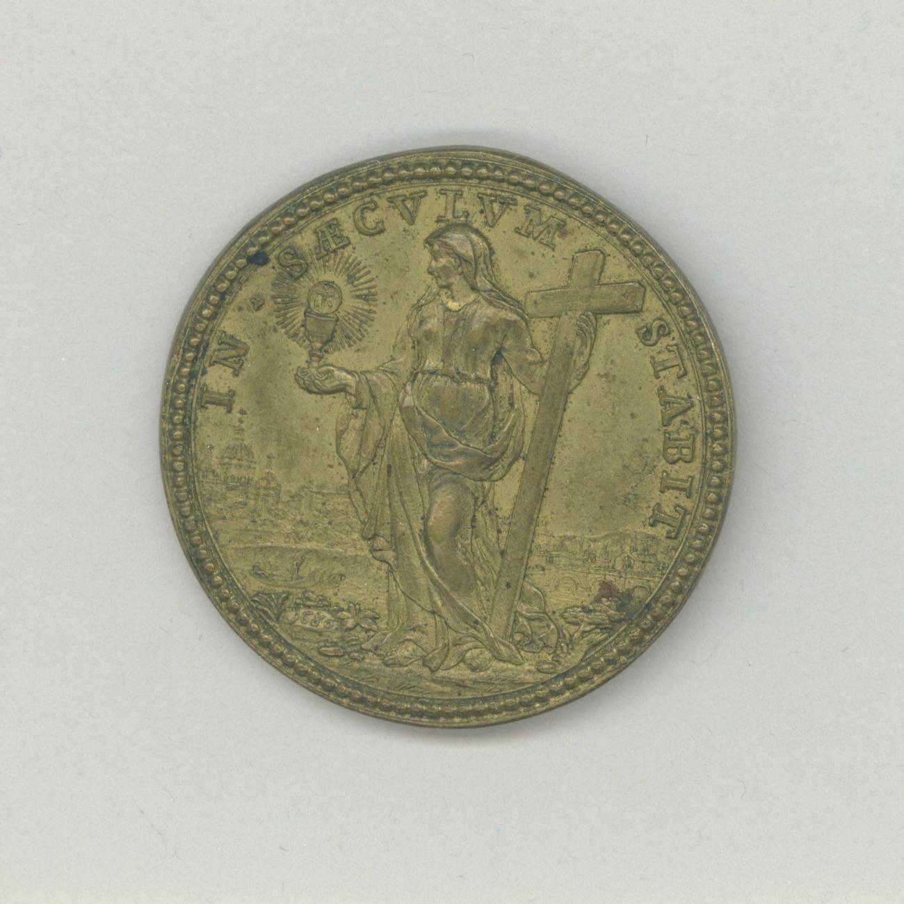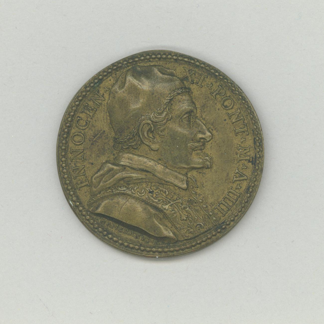 Pauspenning met portret paus Innocentius IX (1676-1689), met "... A IIII", kz. vrouw met kelk, Hostie en kruis