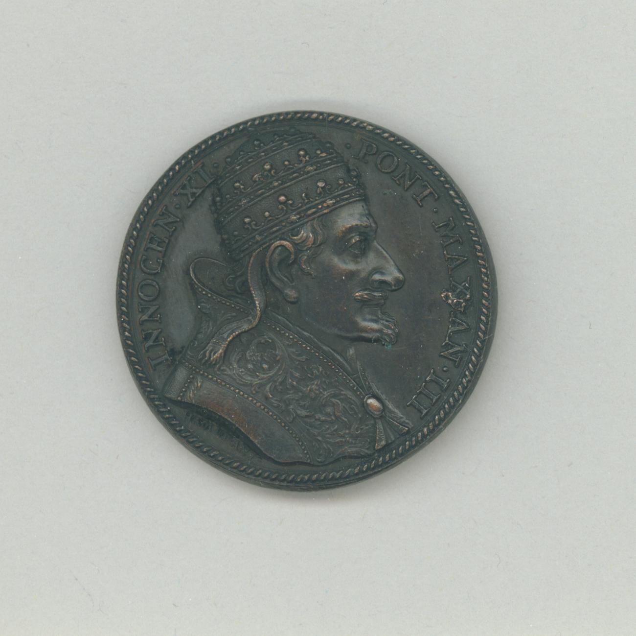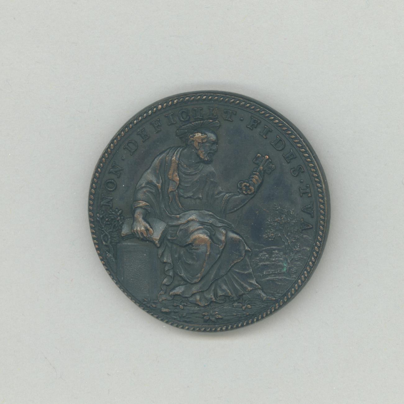 Pauspenning met portret paus Innocentius IX (1676-1689), met "... AN III", kz. Petrus gezeten op steen met twee sleutels en een open boek