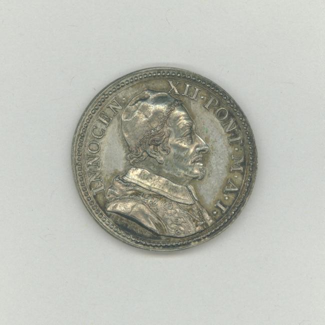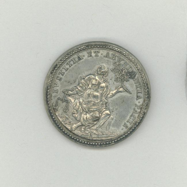 Pauspenning met portret paus Innocentius XII (1691-1700), met "... A I", kz. vrouw, gezeten, met weegschaal en olijftak, aan haar voeten een zwaard, voorstellende de gerechtigheid