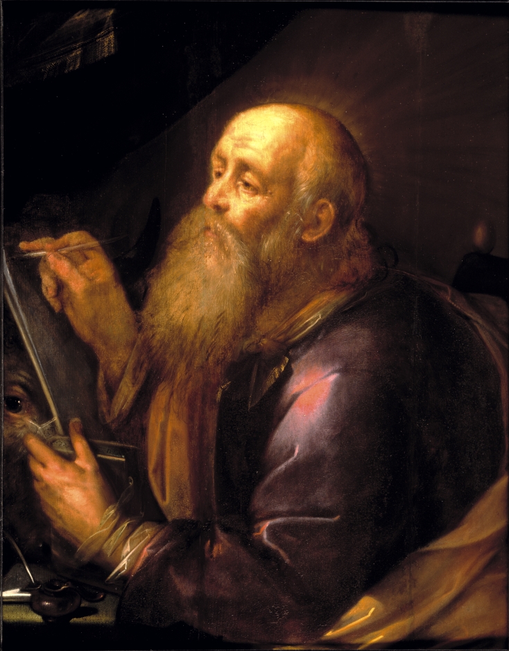Uit cat. Utrecht 2002: Gesigneerd op de snede van het boek in Lucas’ linkerhand: GG (ineen) F. ET INVEN; op de schrijfsteun schuin daarboven opnieuw: GG (ineen) F. Lukas is weergegeven als halffiguur in een vertrek, dat summier wordt aangegeven door een draperie links boven, de bovenzijde van een zetel en een tafel op de ...