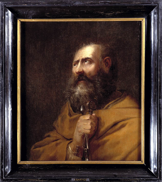 De apostel Petrus, als borststuk tegen een donker achtervlak weergegeven, is naar links (in de richting van het pendant met Paulus) gewend en heeft zijn ogen ten hemel geslagen. Hij draagt een licht-bruine mantel en is voorgesteld met een vrijwel kaal voorhoofd en een korte baard. In zijn rechterhand houdt hij twee sleutels (Petrus' attribuut).