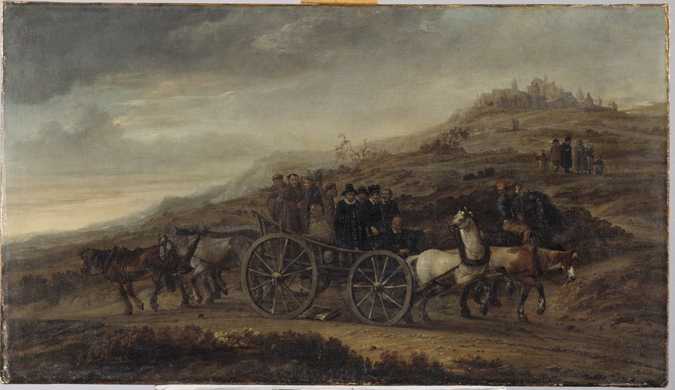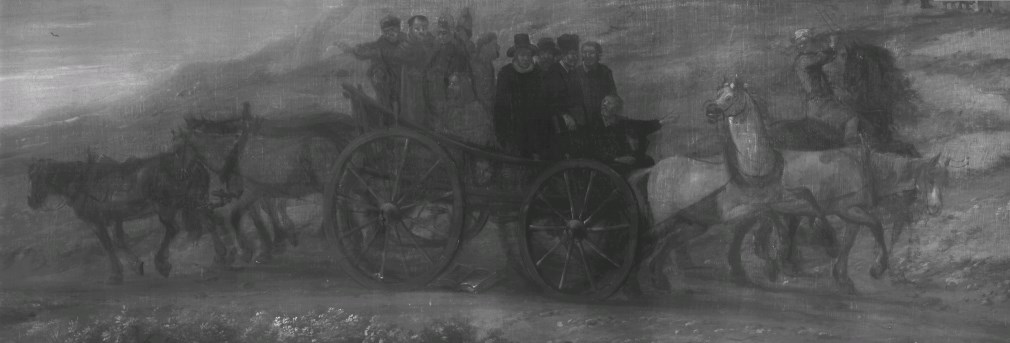 Allegorie op religieuze verdeeldheid, spotschilderij met wagen waaraan aan twee kanten door paarden wordt getrokken