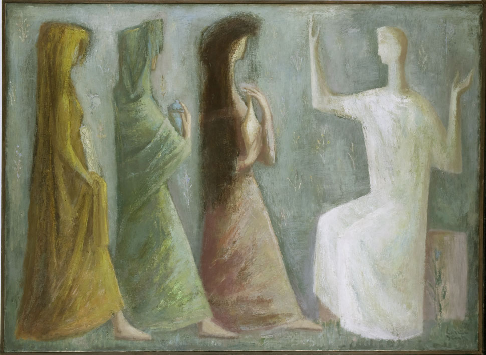Paasmorgen, drie vrouwen en engel bij het graf van Jezus. Gesigneerd en gedateerd rechtsonder: '56 harrie Sterk.