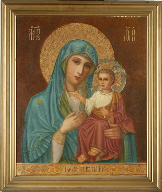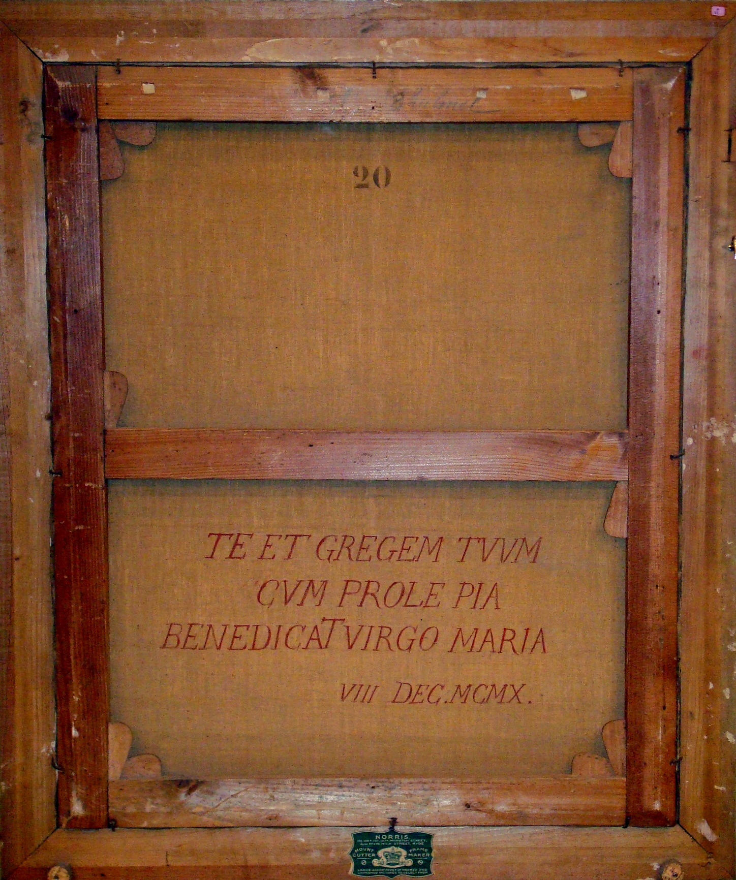 Maria met kind. Op achterzijde doek staat de tekst: Te et gregum tuum cum prole pia benedicat virgo Maria. VIII dec MCMX., 'Moge de Maagd Maria jou en jouw kudde zegenen met haar goddelijk kind. 8 dec 1910.'
