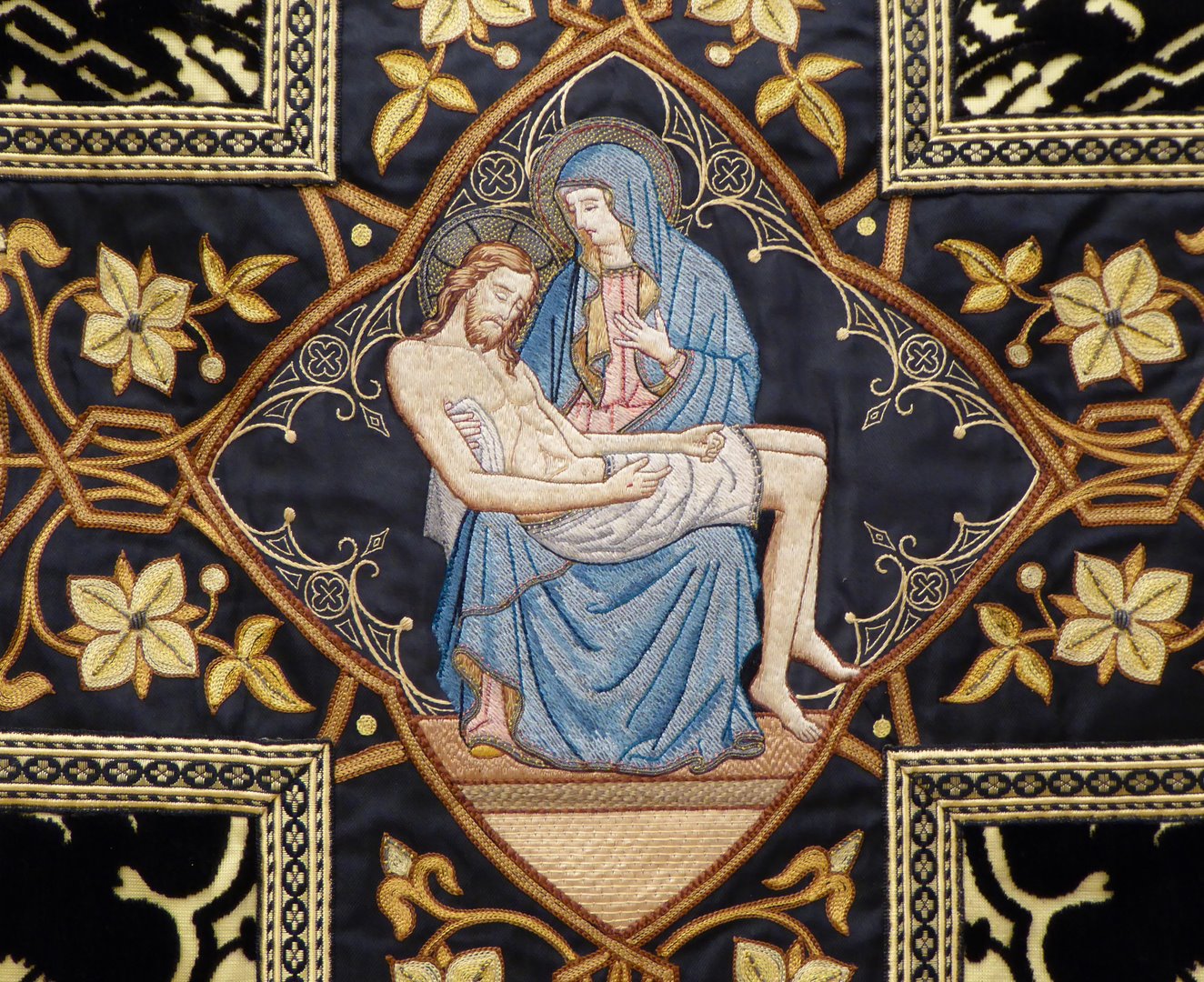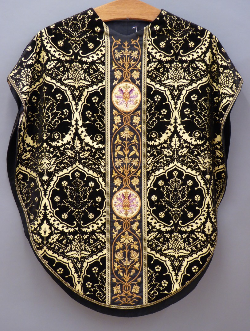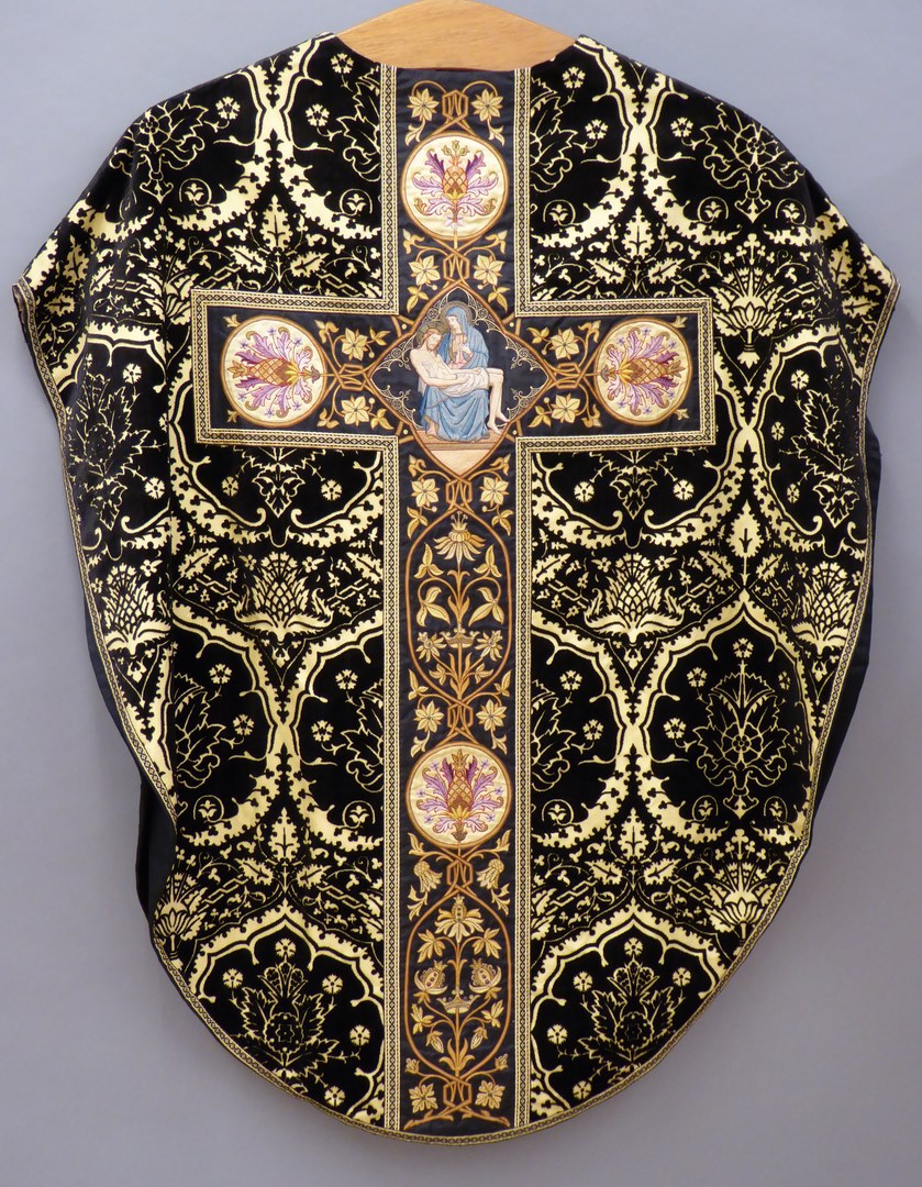 Zwart kazuifel, granaatappelpatroon op gele ondergrond, kruis met piëta
