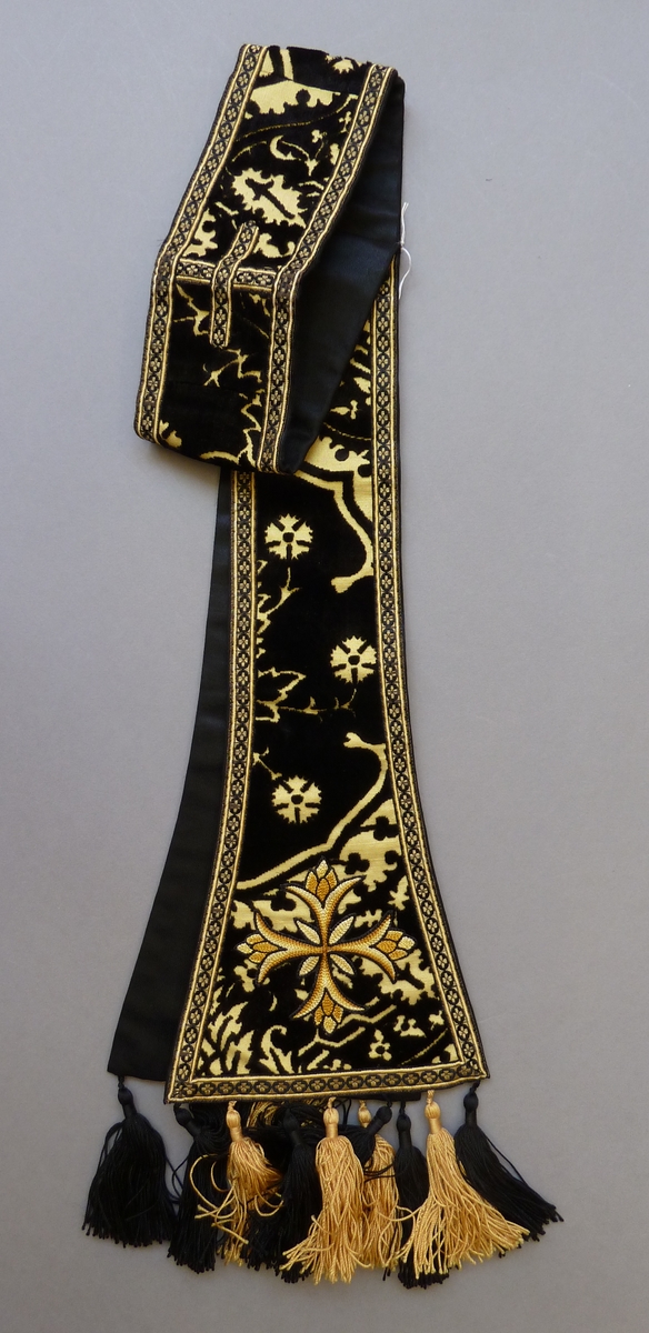 Zwarte manipel met zwart-gele franje, leliekruis en granaatappelmotief tegen gele achtergrond