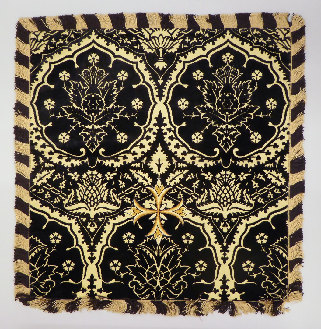Zwarte kelkvelum met granaatappelpatroon op gele achtergrond, geel leliekruis