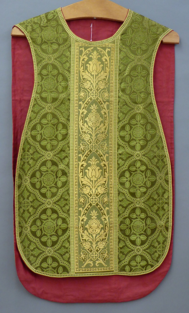Groen kazuifel met geweven sierrand en kruis, op de rug IHS en kruis