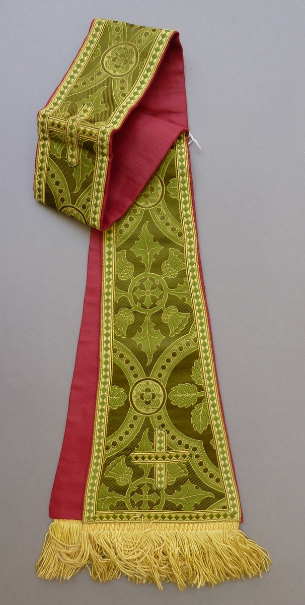 Groene manipel met gele franje en ingeweven distels en passiebloemen in vierpassen