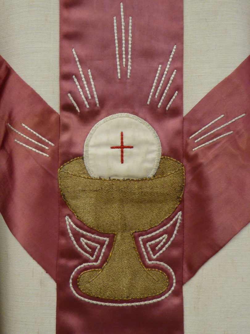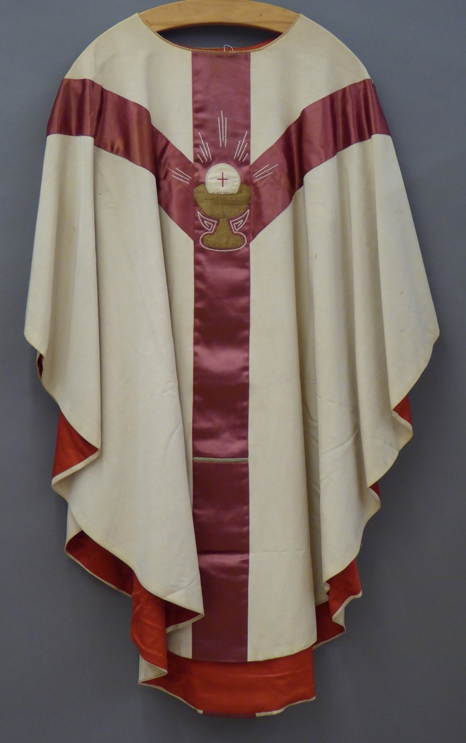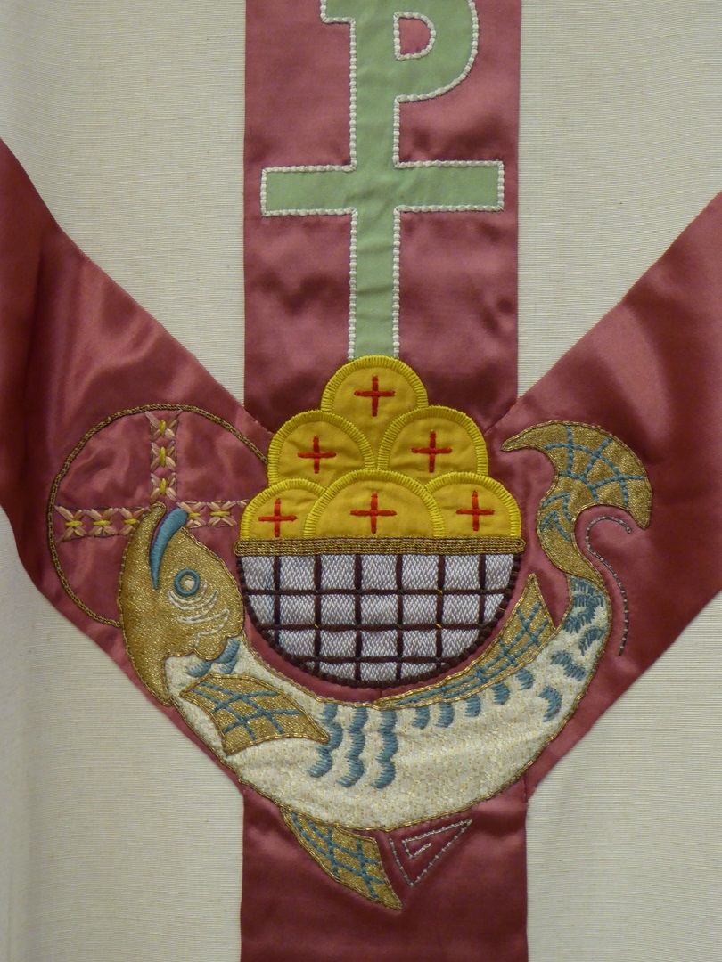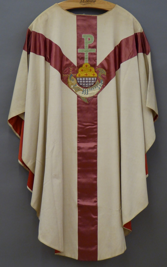 Wit kazuifel, capevormig, met roze gaffelkruisen, hosties en vis