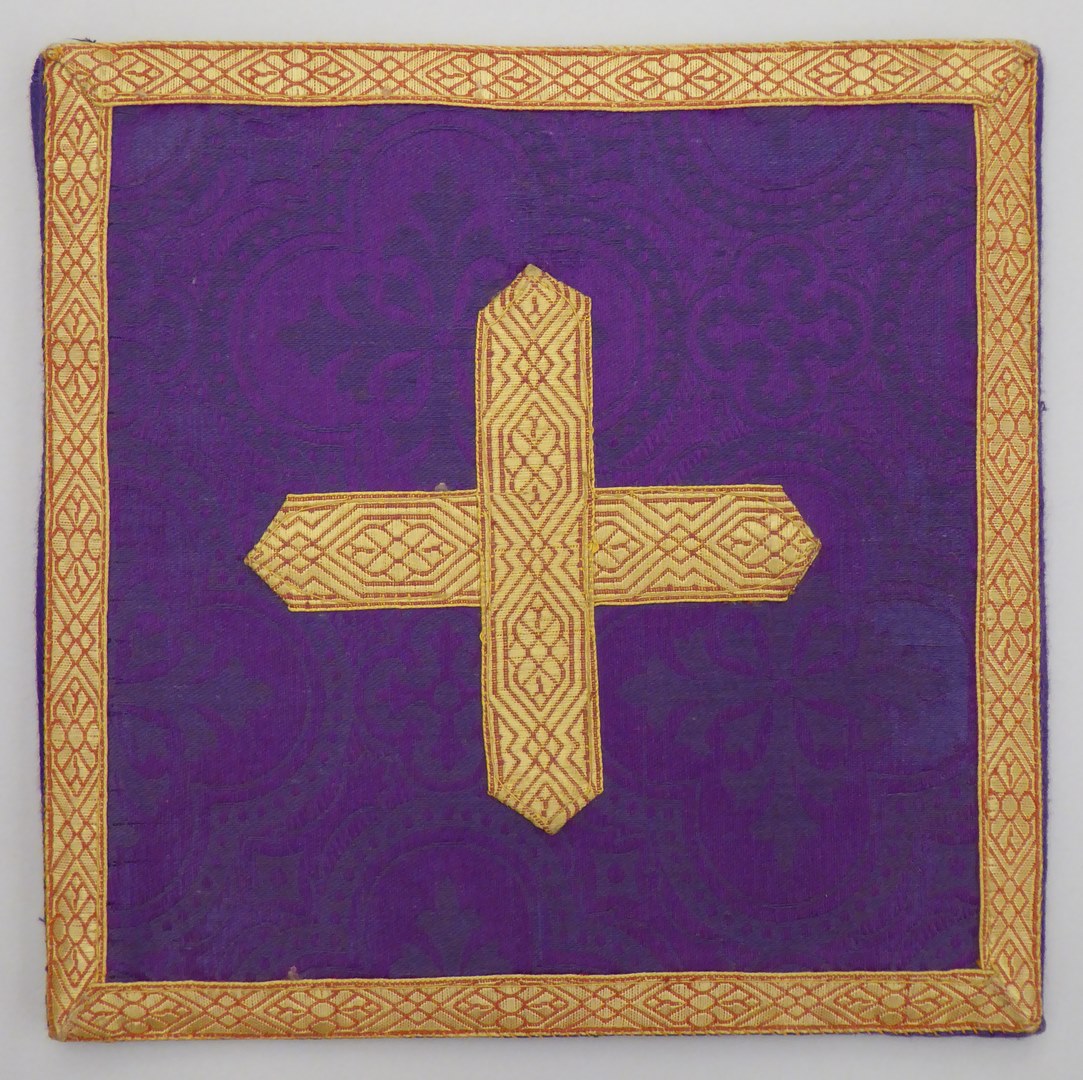 Paarse beurs met ingeweven leliekruisen in vierpassen, kruis en rand van geel-rood galonband