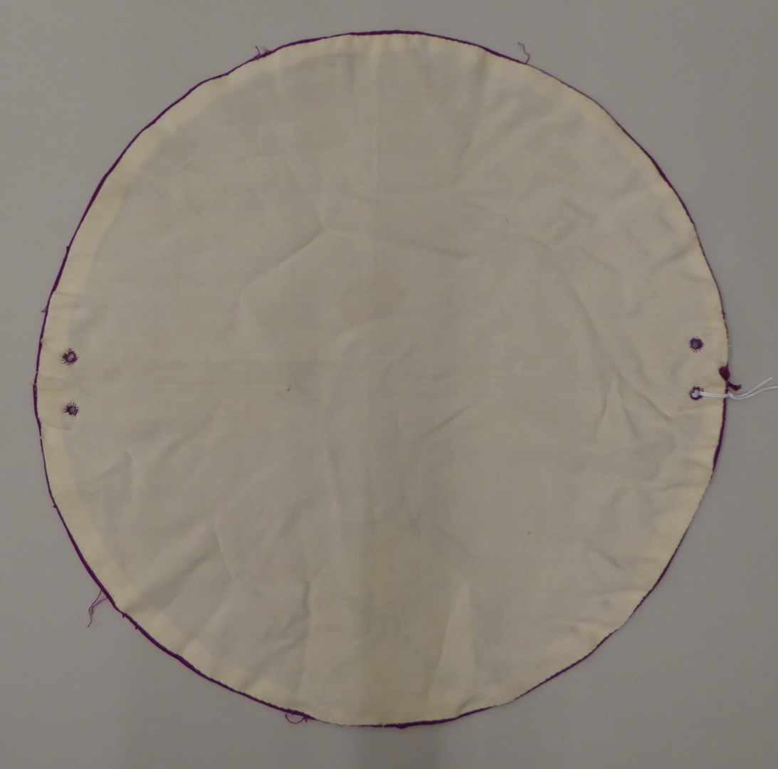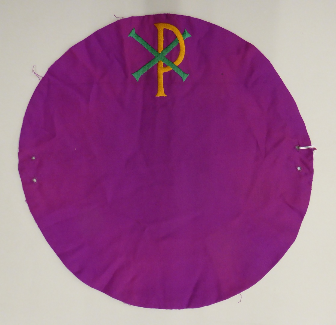 Paarse ziekenbeurs met geel-groen geborduurd christusmonogram