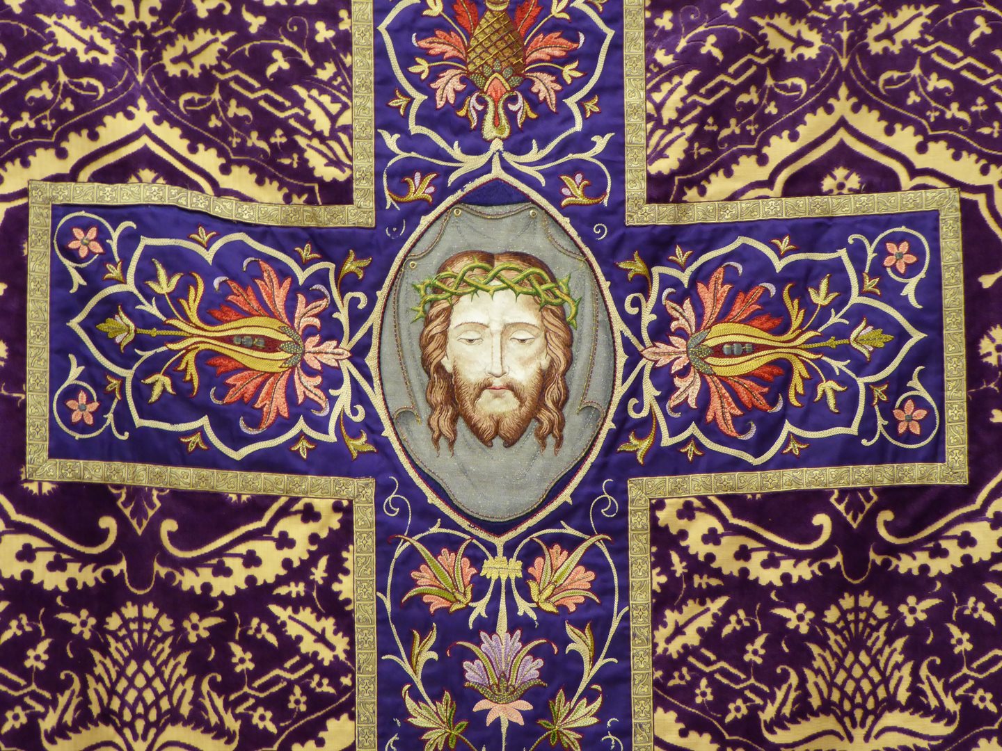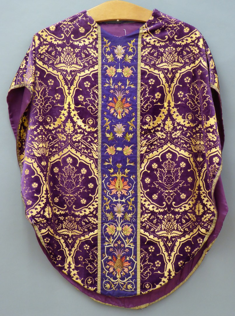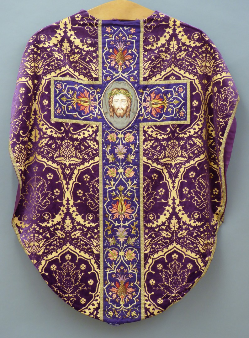 Paars kazuifel met machinaal borduurwerk: veronicadoek en bloemranken