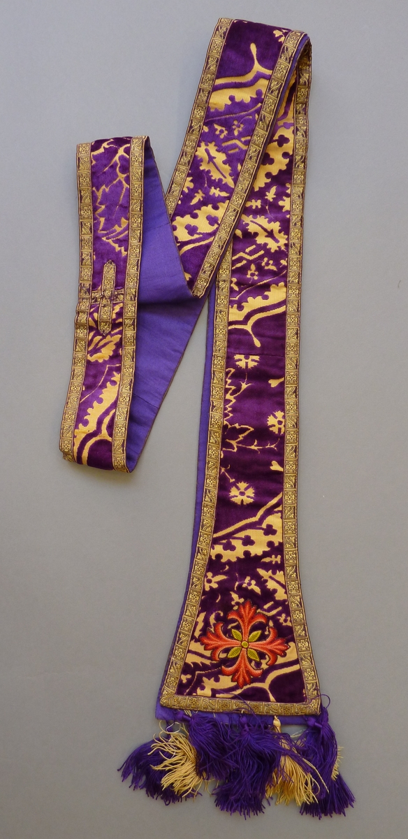 Paarse stola met paars granaatappelpatroon op gele achtergrond en geborduurde leliekruisjes
