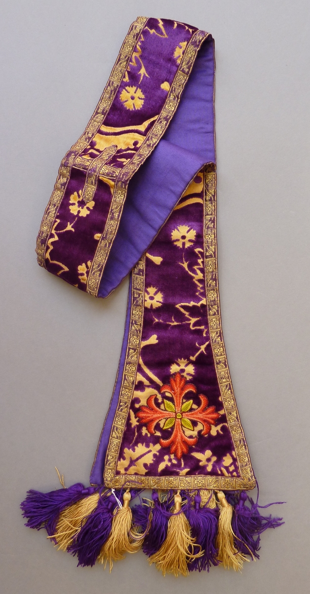 Paarse manipel met paars-gele franje en granaatappelmotief tegen gele achtergrond
