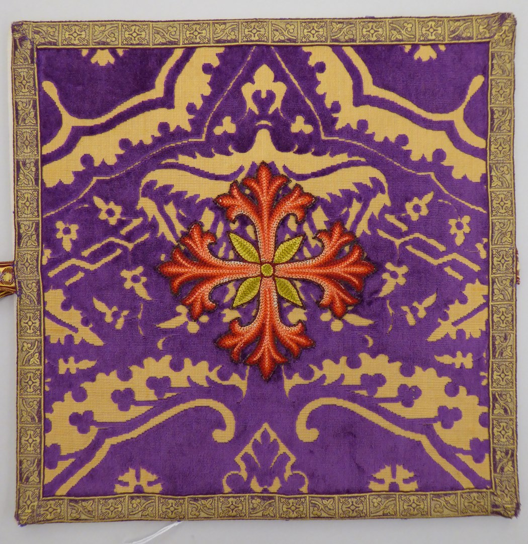 Paarse beurs met granaatappelmotief op gele ondergrond, geborduurd rood-groen leliekruis