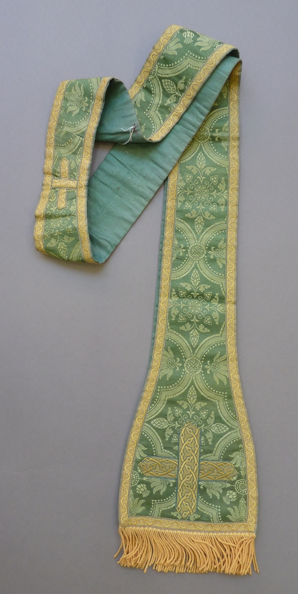 Groene stola met lichtgroen ingeweven patroon van medaillons, kruisjes van geel-groen galonband