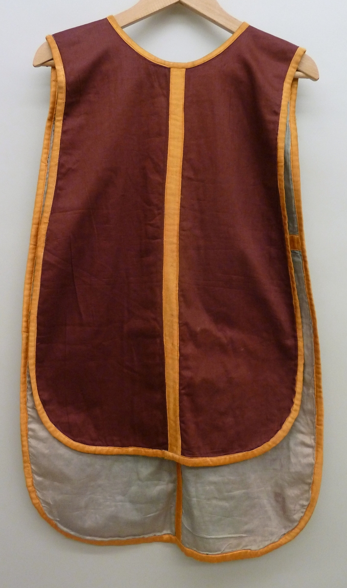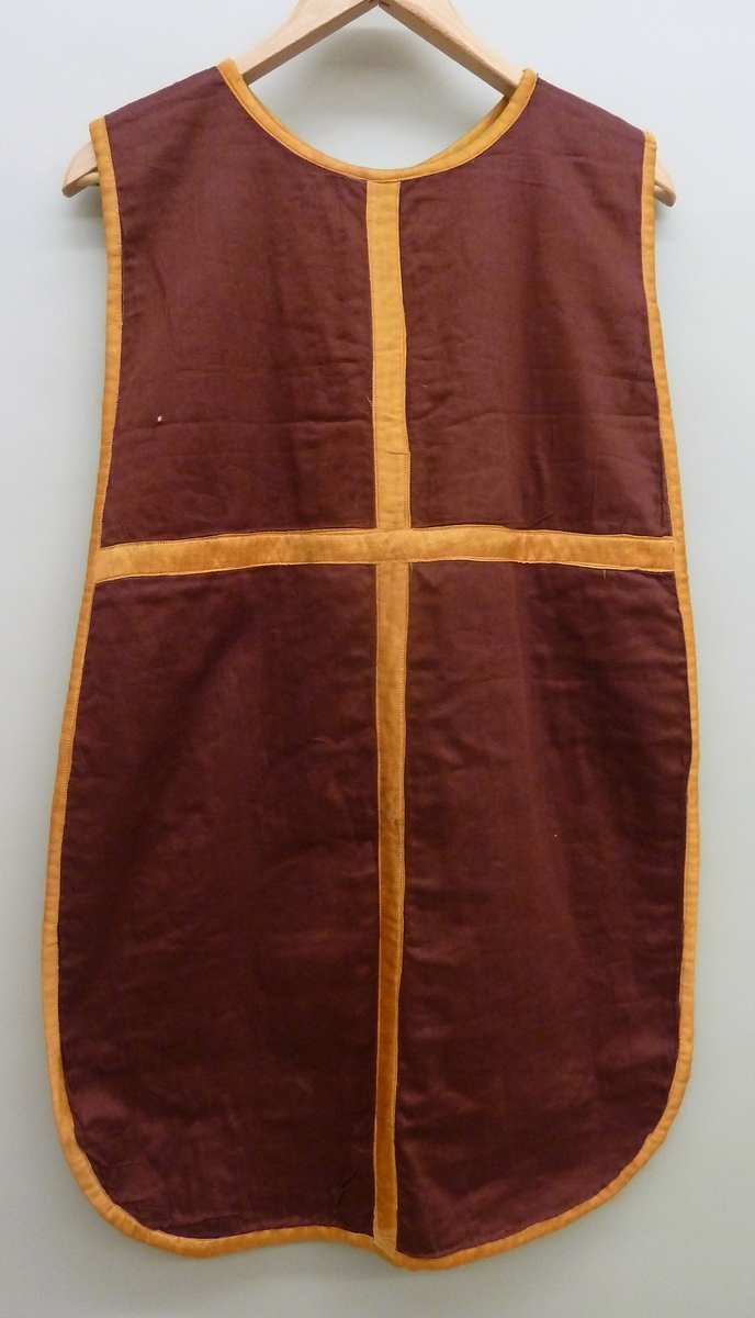 Roodbruin kinderkazuifel voor kindermis met oranje sierstrook en kruis