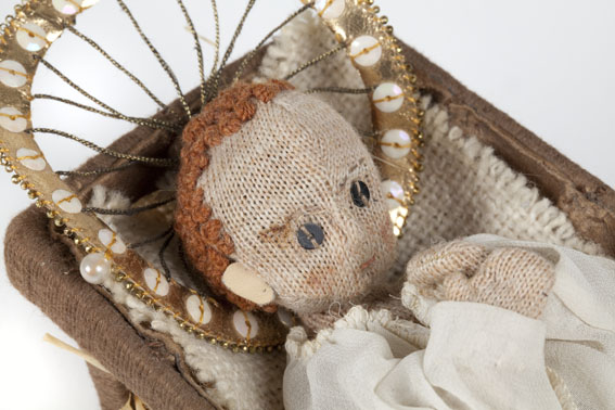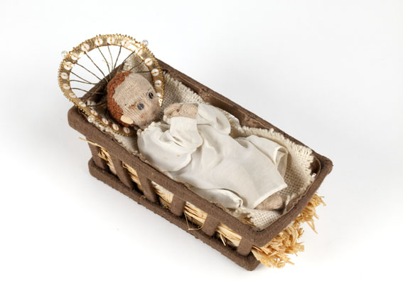 Kindje Jezus met aureool liggend in kribbe