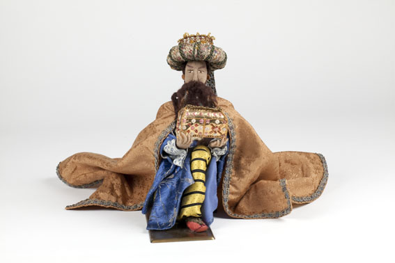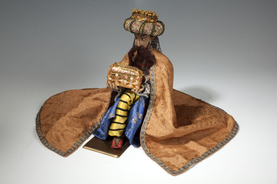 Koning Melchior, knielend, gehuld in beige mantel met tulband, met kistje met goud