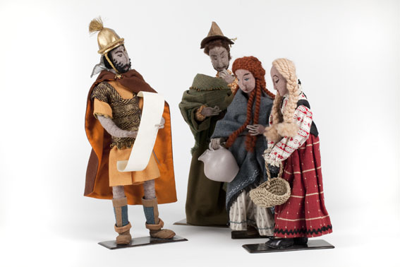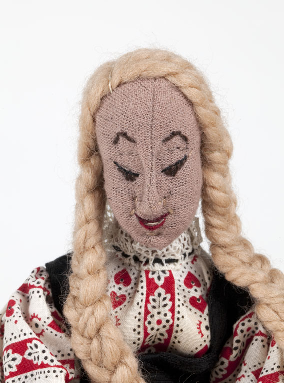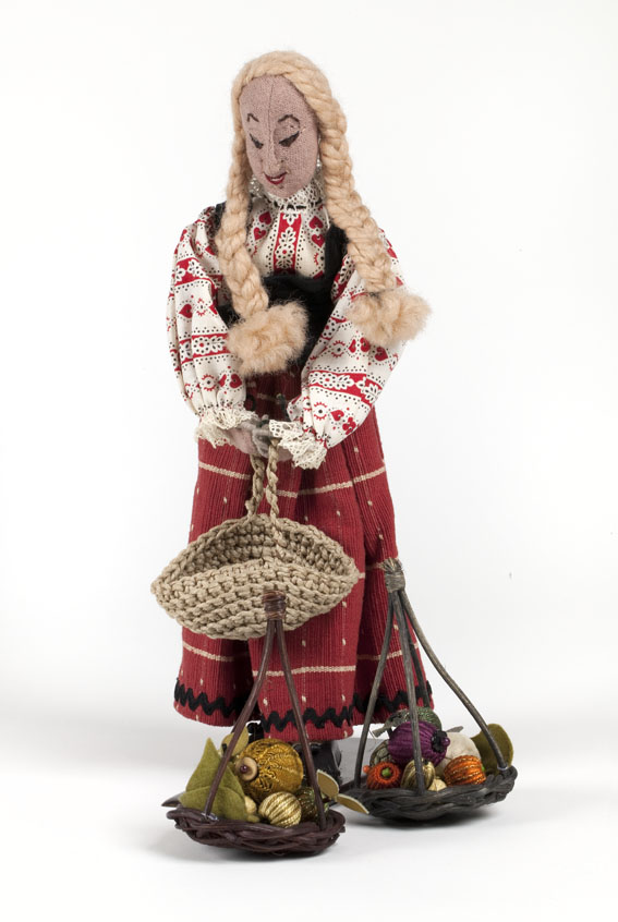 Herderin met vlechten, rode rok en mand met vijf stuks fruit