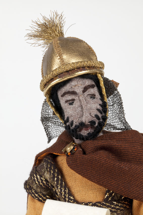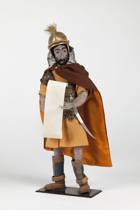Krijgsman met helm, zwaard, kuras en bruine mantel