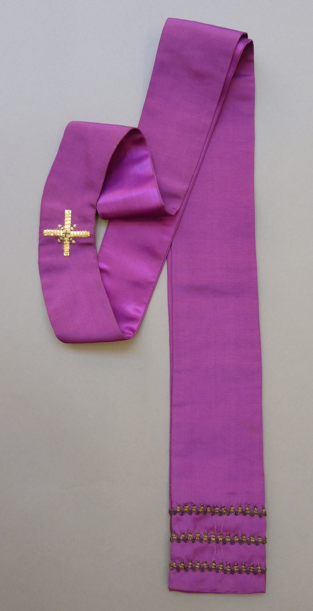 Paarse stola met goudleren kruisje aan de uiteinden met gouddraad en paars geborduurd