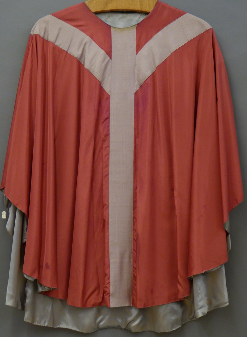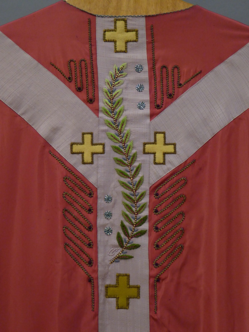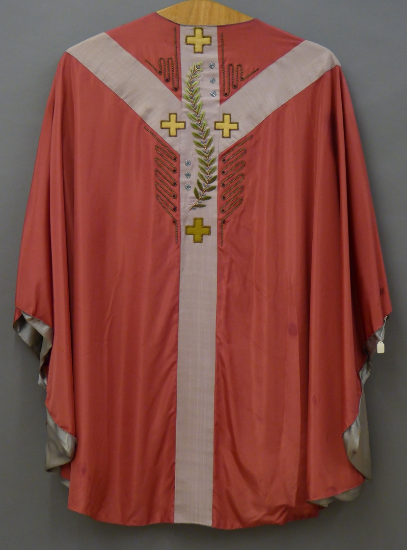 Roze capevormige kazuifel met grijs gaffelkruis met groene palmtak