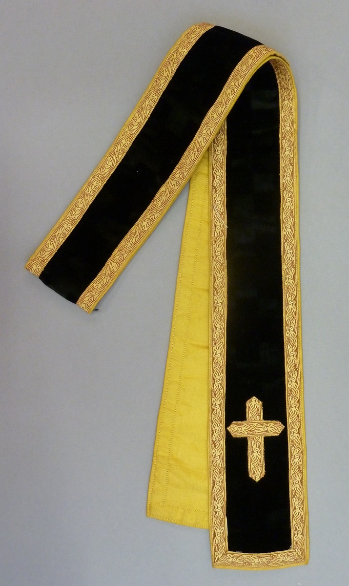 Zwarte kinderstola afgezet met geel-rood galonband