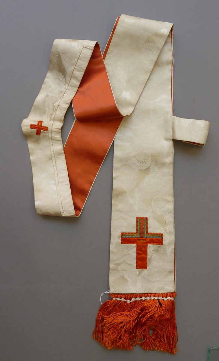 Witte stola met ingeweven bladeren, oranje geappliceerde kruisjes